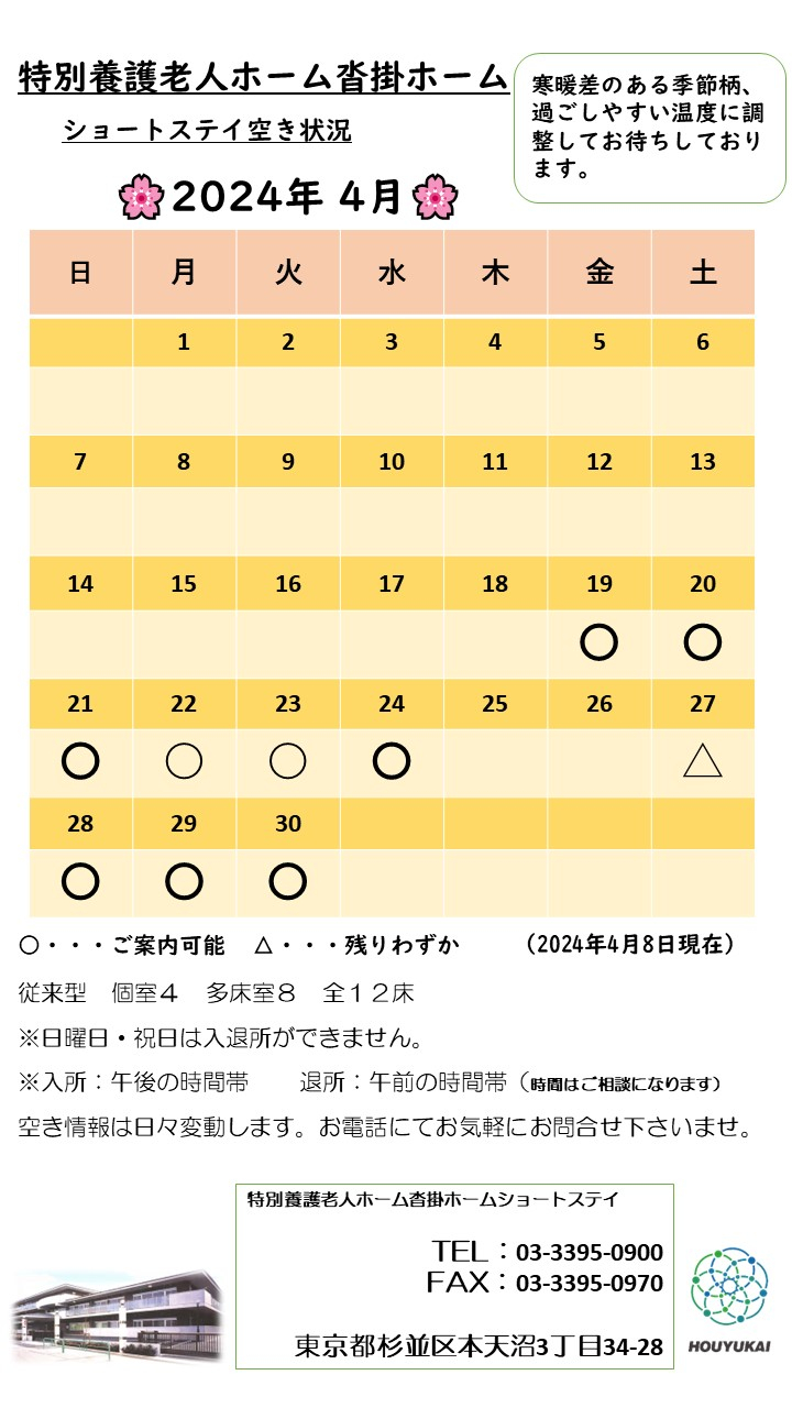 2024.04.08 お知らせ 空床情報☆ Tweet シェアする ショートステイの空床情報をお知らせします。 キャンセル等によりご案内可能な場合もございますので、お気軽にお問合せください。 支援課 吉田 前の記事 2024.04.09 お知らせ お花見☆ 次の記事 2024.04.03 お知らせ 近々お花見です🌸 一覧へ戻る