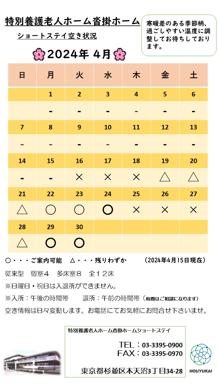 2024.04.15 お知らせ 空床情報☆ Tweet シェアする ショートステイの空床情報をお知らせします。 キャンセル等によりご案内可能な場合もございますので、お気軽にお問合せください。 支援課 吉田 前の記事 2024.04.17 お知らせ お花見バルーン☆2 次の記事 2024.04.12 お知らせ お花見バルーン☆ 一覧へ戻る