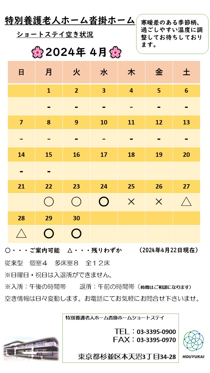2024.04.22 お知らせ 空床情報☆ Tweet シェアする ショートステイの空床情報をお知らせします。 キャンセル等によりご案内可能な場合もございますので、お気軽にお問合せください。 支援課 吉田 前の記事 2024.04.26 お知らせ ドッグセラピー☆ 次の記事 2024.04.17 お知らせ お花見バルーン☆2 一覧へ戻る