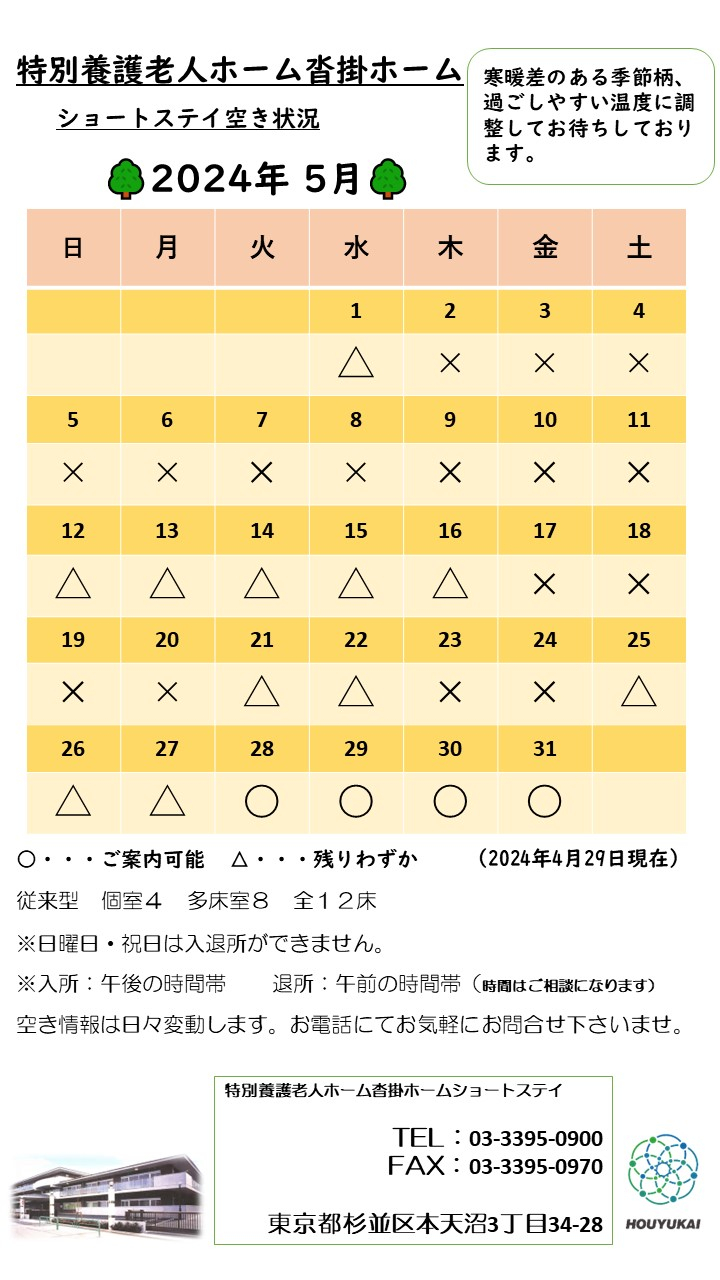 2024.04.29 お知らせ 空床情報☆ Tweet シェアする ショートステイの空床情報をお知らせします。 キャンセル等によりご案内可能な場合もございますので、お気軽にお問合せください。 支援課 吉田 前の記事 2024.05.02 お知らせ 菖蒲湯☆ 次の記事 2024.04.26 お知らせ ドッグセラピー☆ 一覧へ戻る