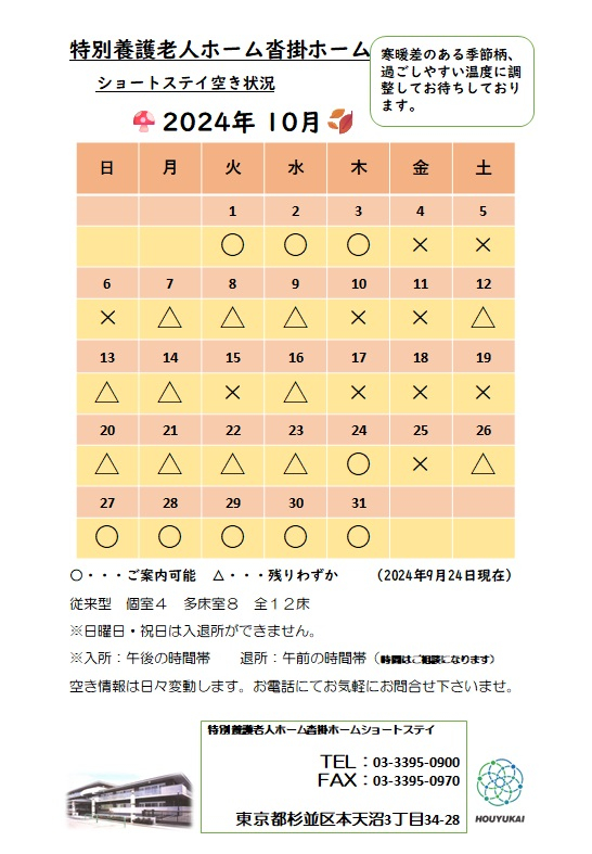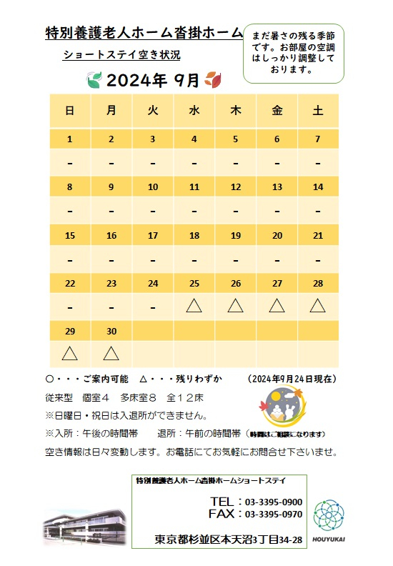 2024.09.23 活動報告(IN) 空床情報☆ Tweet シェアする ショートステイの空き状況です。 本日より10月分も上げておりますので、是非ご覧ください。 - 沓掛ホーム支援課 田巻 #沓掛ホーム 前の記事 2024.09.26 活動報告(IN) 沓掛ホーム花火大会☆開催しました! 次の記事 2024.09.18 活動報告(IN) 沓掛ホーム花火大会☆開催のお知らせ 一覧へ戻る