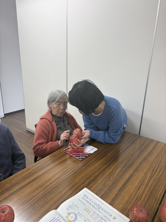実際のりんごを手に取り、色や形、重みや質感を感じながら
