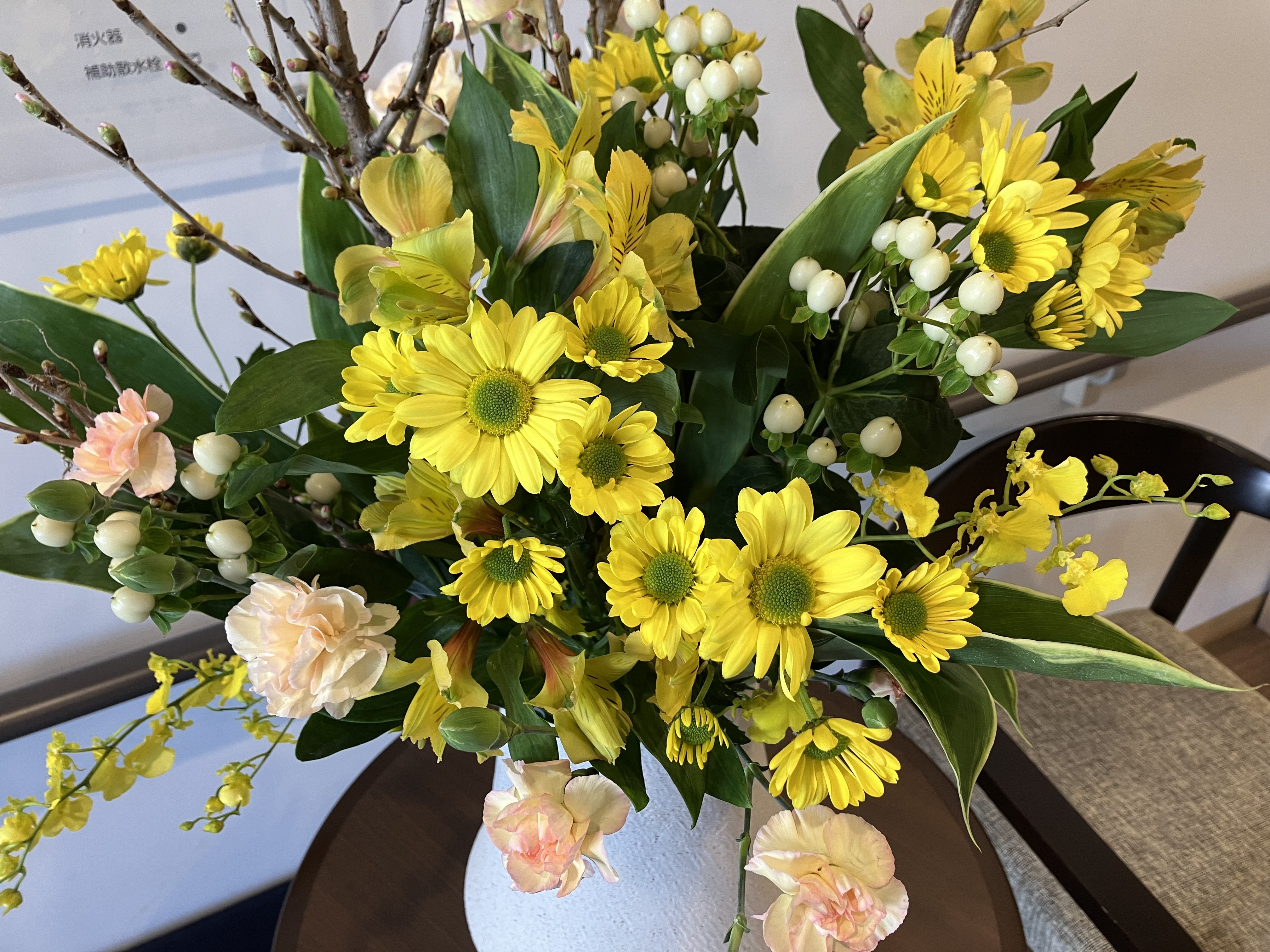 桜、アルストルメリア、スプレーマム、スプレーション、ヒペリカム、オンシジュウムです。