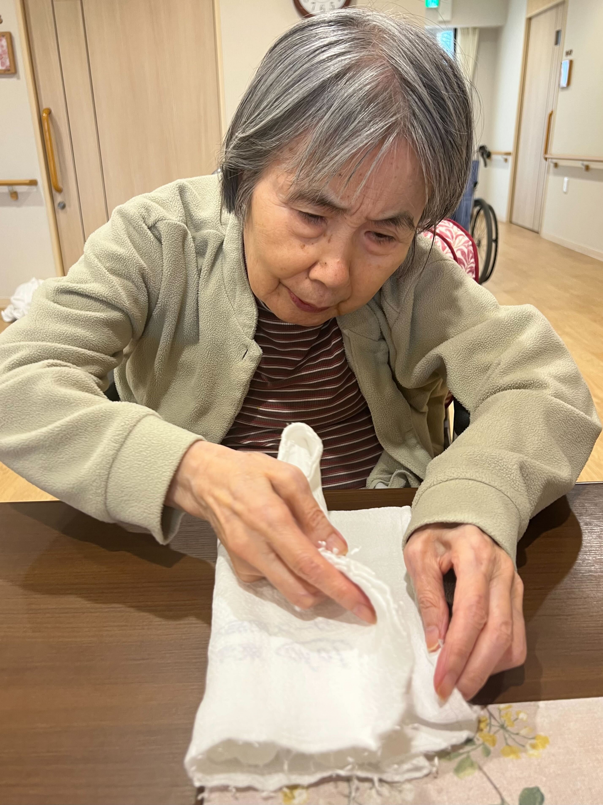 2025.12.05 特別養護老人ホーム 【日常生活】タオルたたみ* Tweet シェアする こんにちは♩ 先日、皆様にタオルを畳んでいただきました(^^) 手際良く畳んでくださりありがとうございます♡ またお願いしますね! 介護2課 いたくら 前の記事 2025.12.05 特別養護老人ホーム クリスマスツリーの飾り付け 次の記事 2025.12.04 特別養護老人ホーム ブーゲンビリア 一覧へ戻る