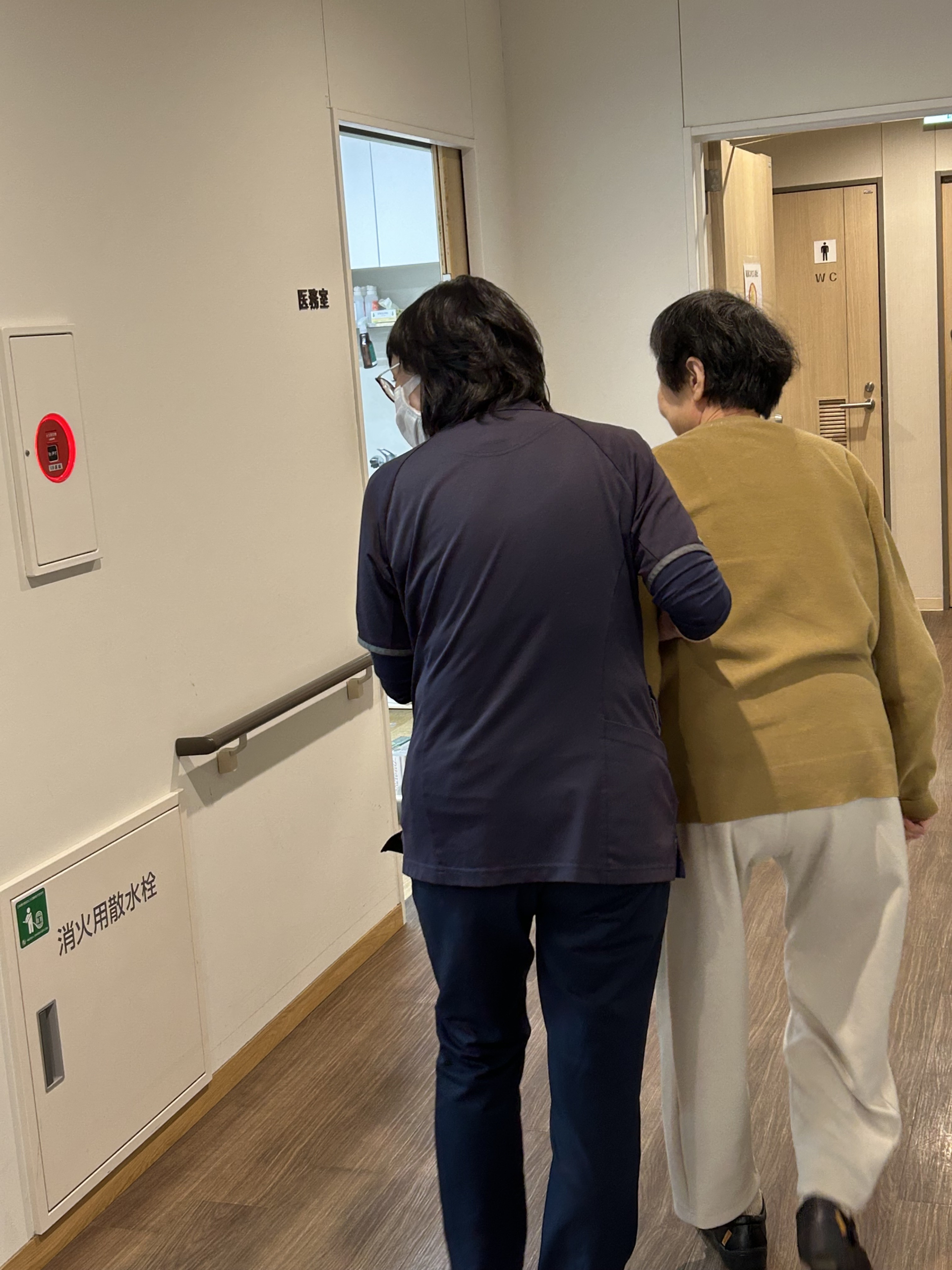 今日は、機能訓練指導員と施設の中をお散歩です。