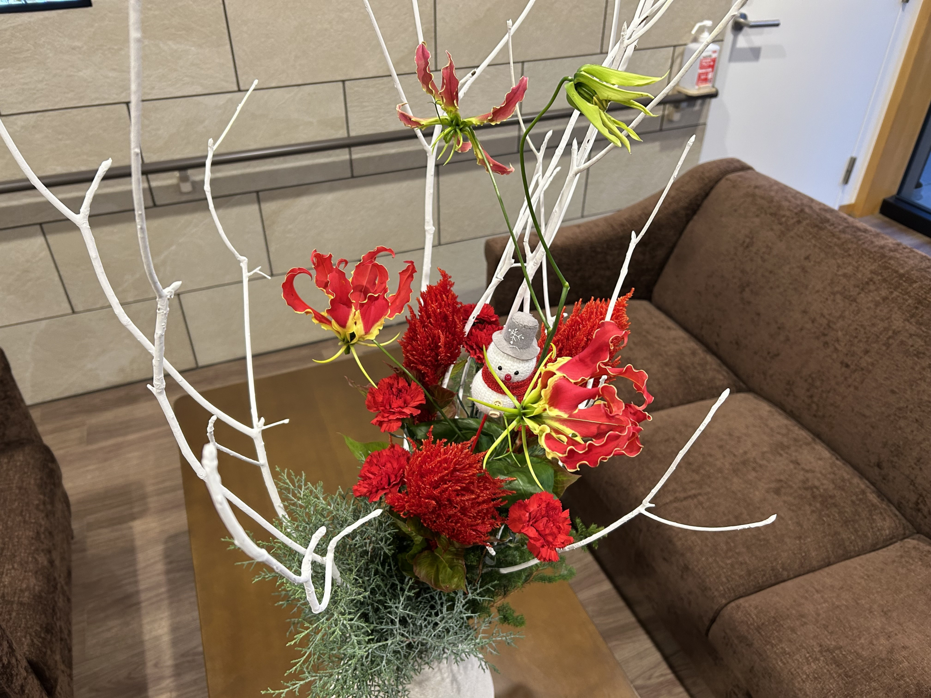 白い枝と赤い花、緑の木が入るとクリスマスっぽいですね!!