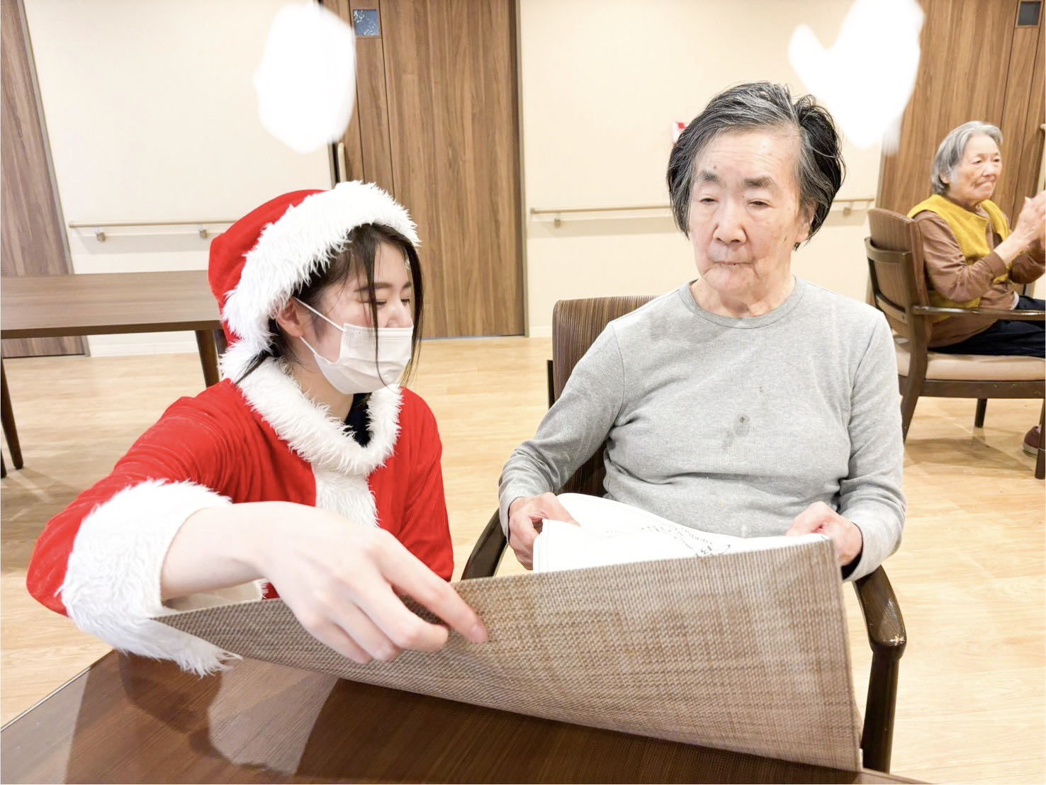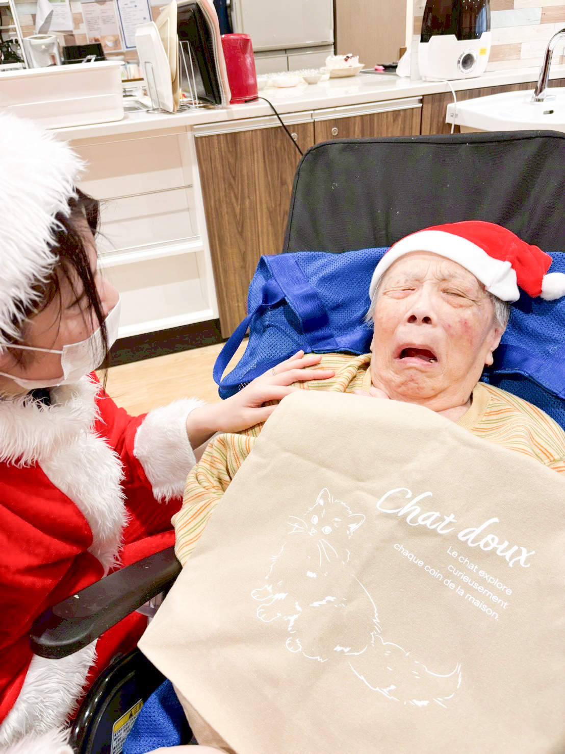 こちらの女性はまずはサンタの衣装を触って「サンタの衣装、すごく暖かそうだね~気持ちいいね」と笑っており、プレゼントがありますよとお伝えすると「え??プレゼントがあるの??」と驚かれていました。