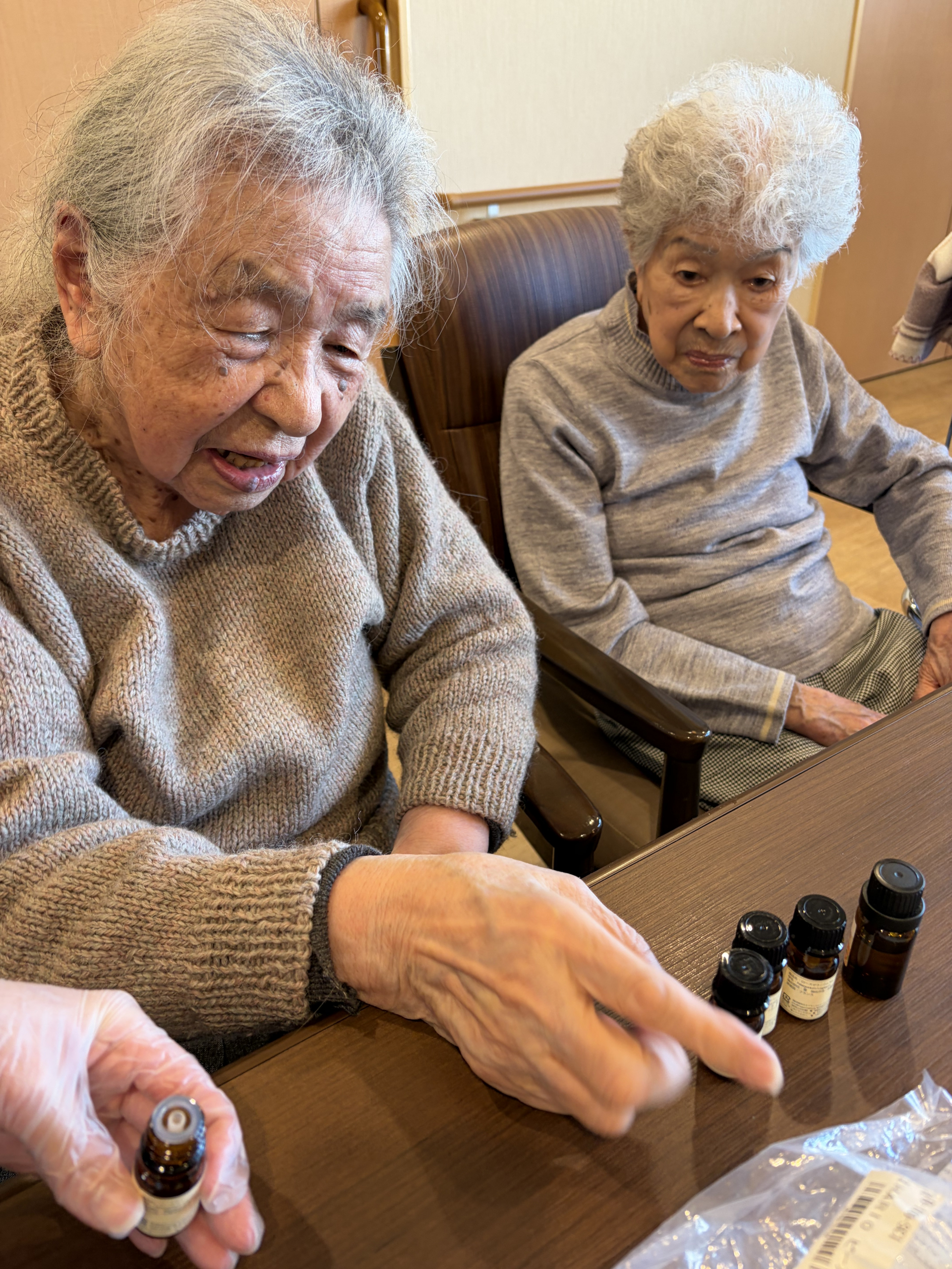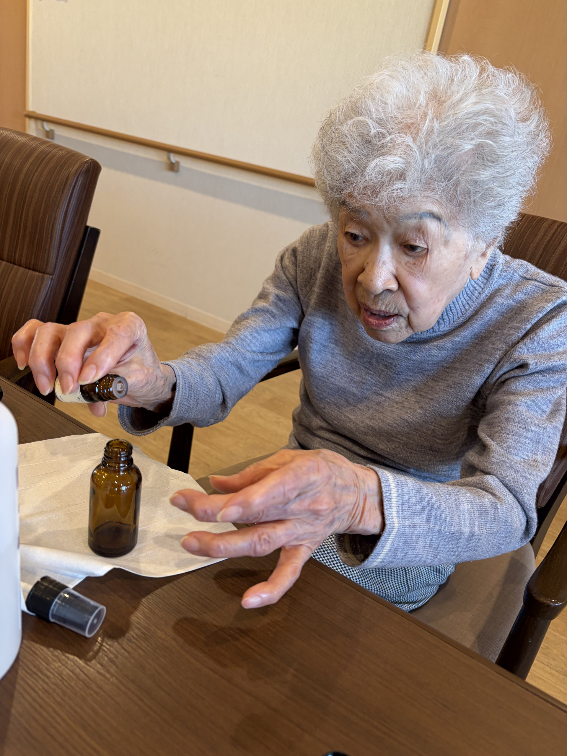 ご利用者様それぞれお好みのアロマスプレーを作りました。完成品を試しに使用してみると「いいにおい!」と笑顔でおっしゃっていました。