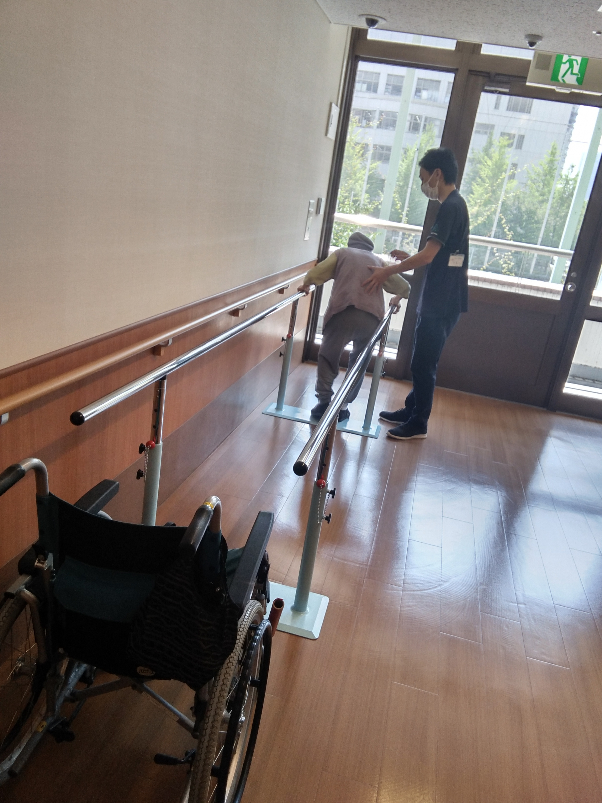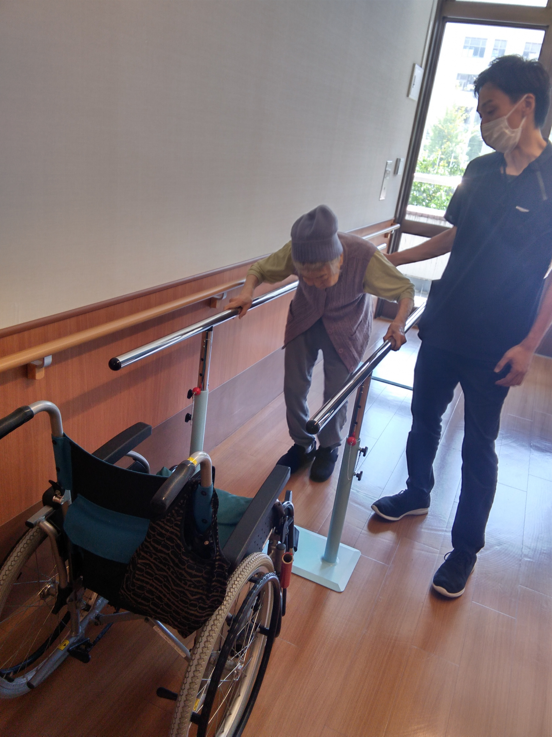 まずは個別リハビリ☆平行棒を使って歩行練習をしているY様です。