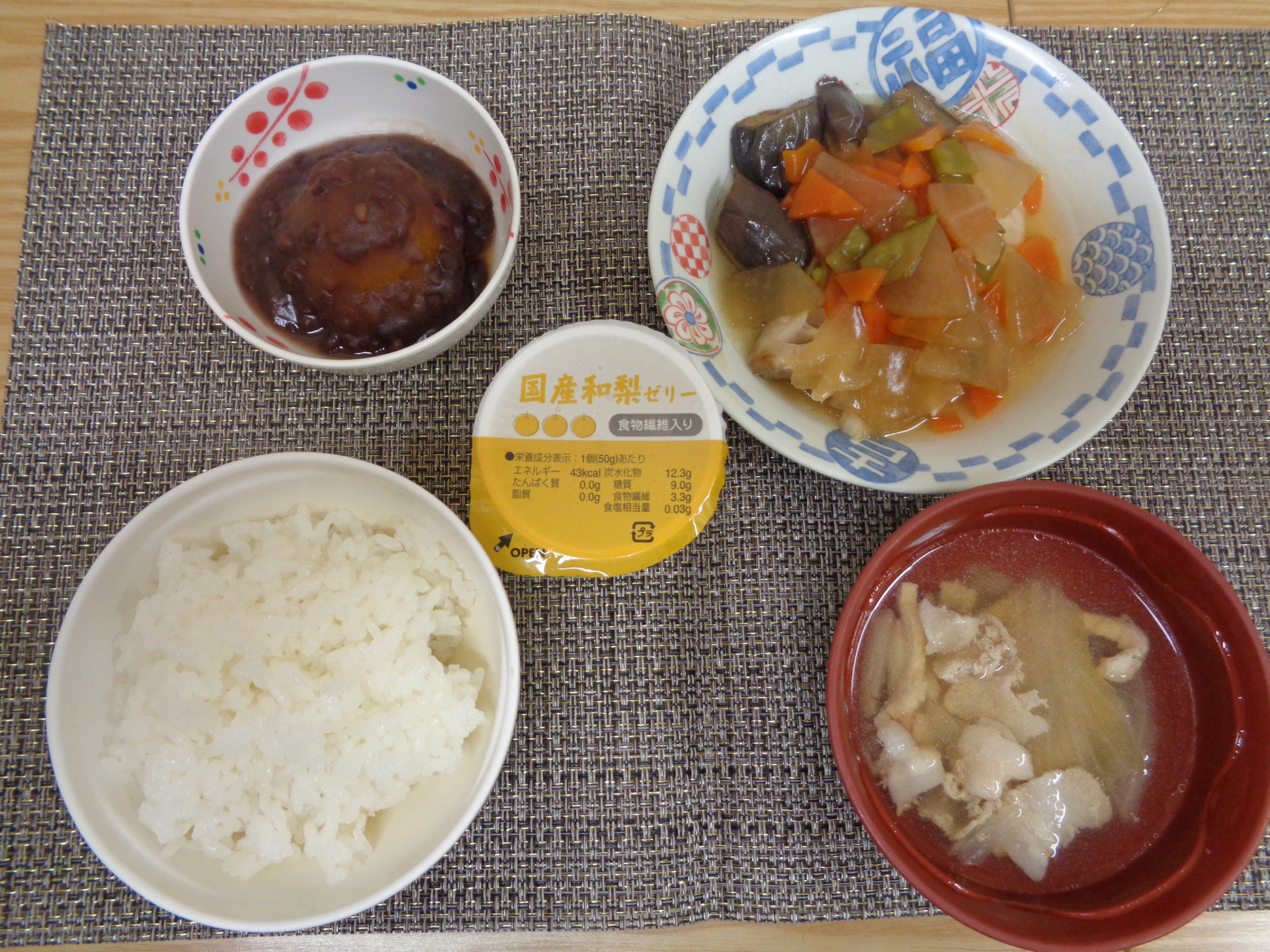 写真の左上からかぼちゃのいとこ煮、赤魚のあんかけ、梨ゼリー、ごはん、塩ちゃんこスープです。
