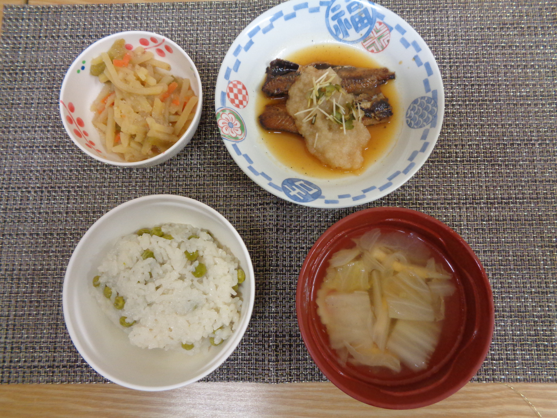豆ごはん、いわしの梅おろし、じゃが芋金平、鬼除け汁です。可愛らしいカードも添えられていました。