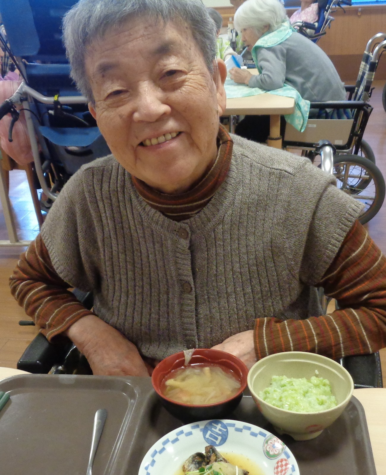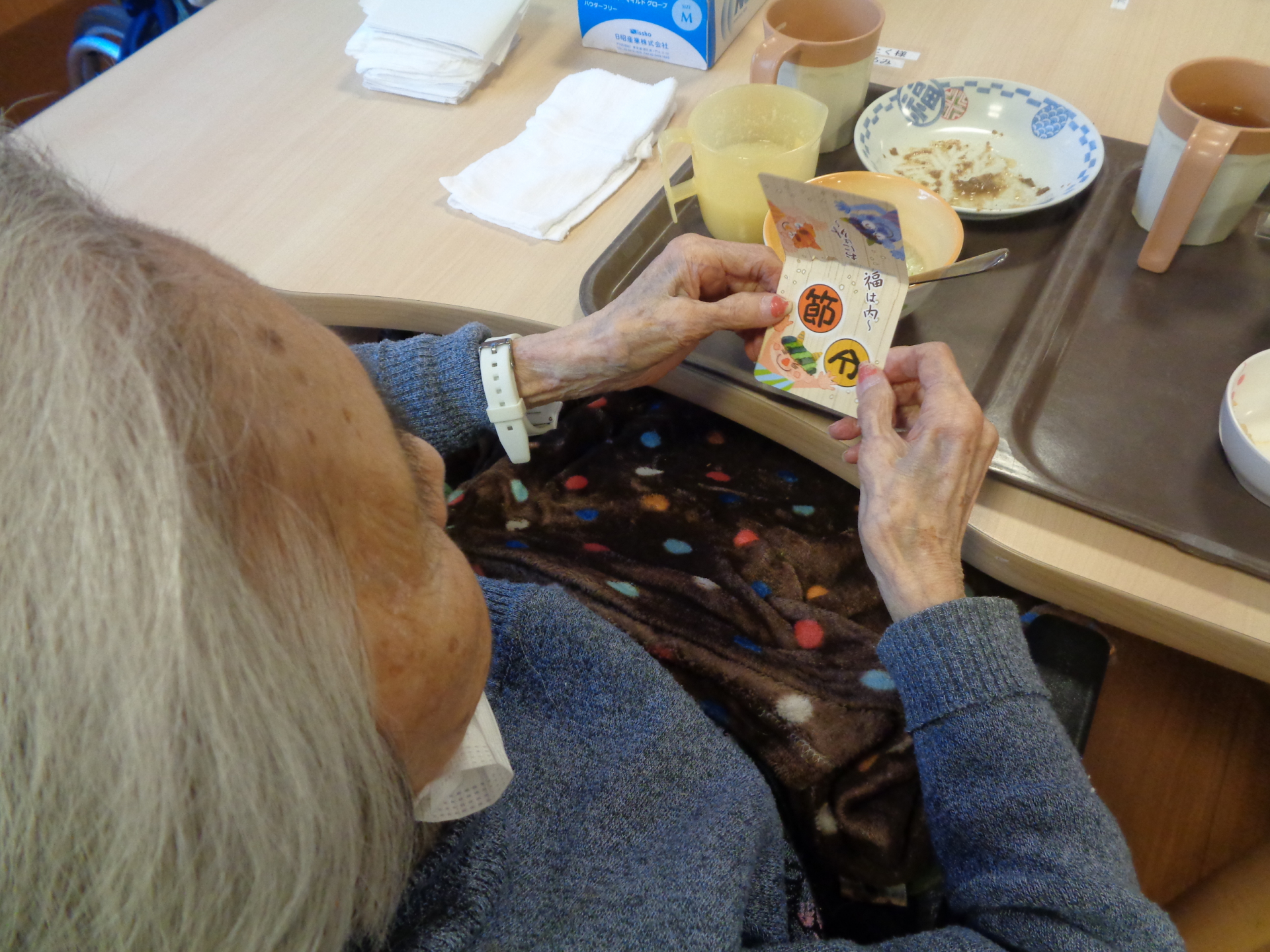 皆さん「歳の数だけ豆を食べるのは無理ね~」とお話ししたり、食事に添えられたカードを見ながら「鬼は外!福は内!!」と掛け声を掛けたりと楽しまれていました。