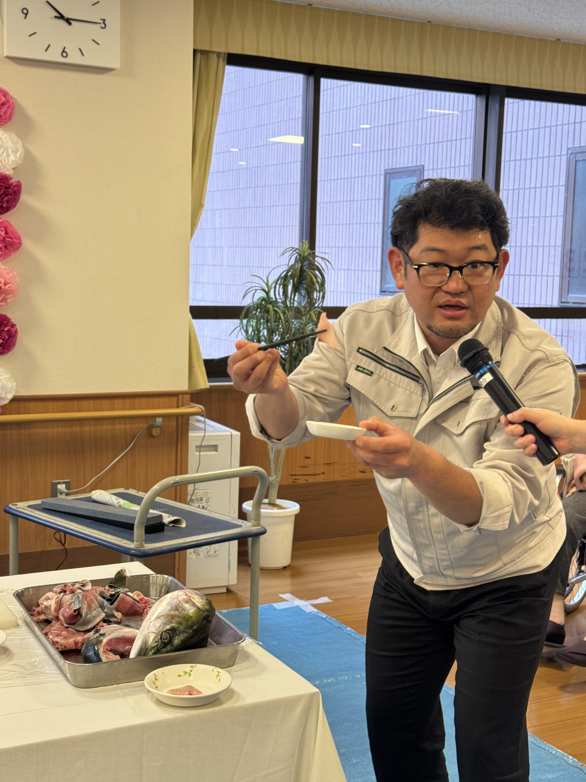 本日開催したぶりの解体ショーには、施設長も参加いたしました。