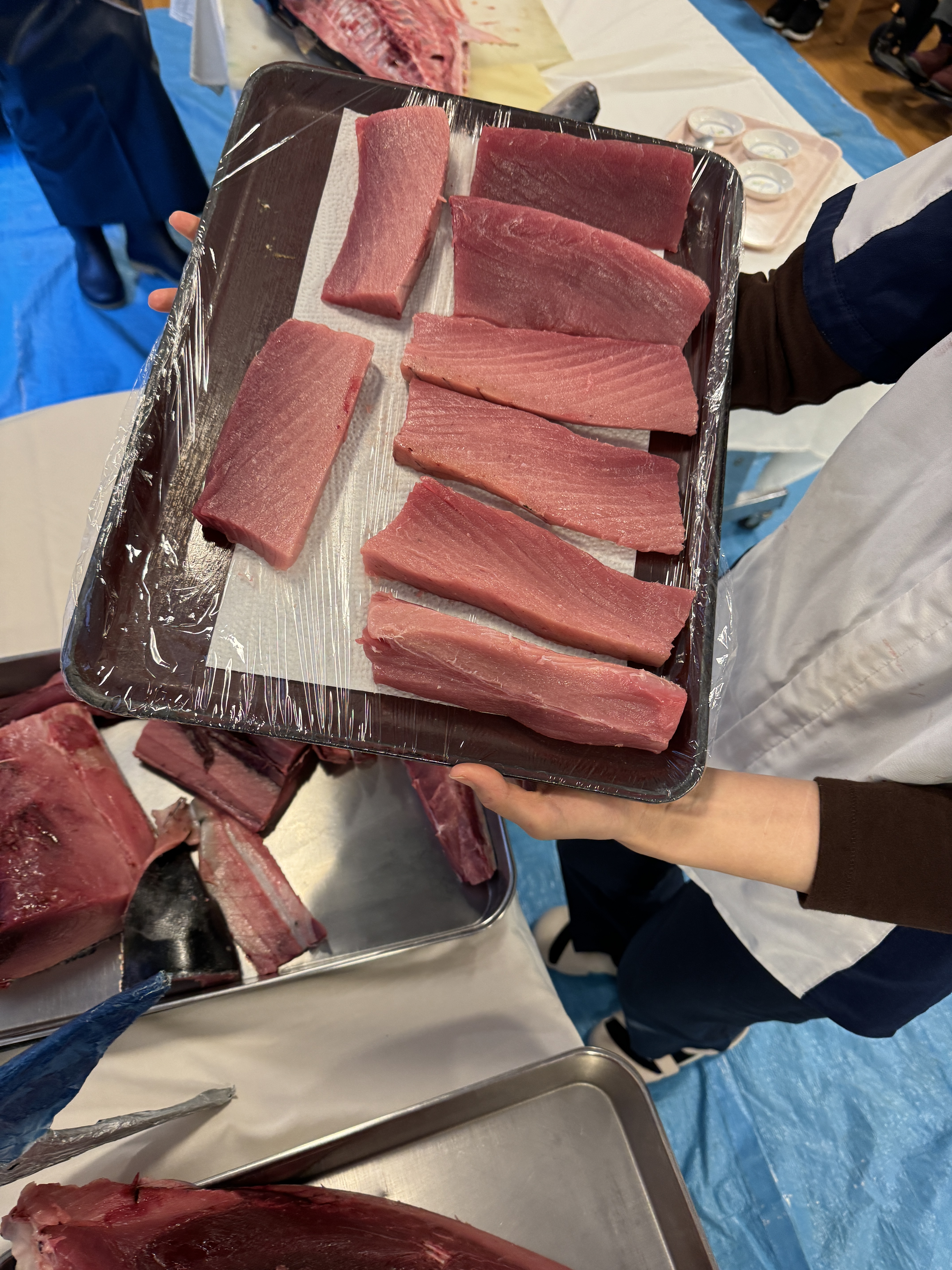 途中に捌きたてのマグロの味見もしました♪「おいしい、目の前でみれて感動した」とのことでした!