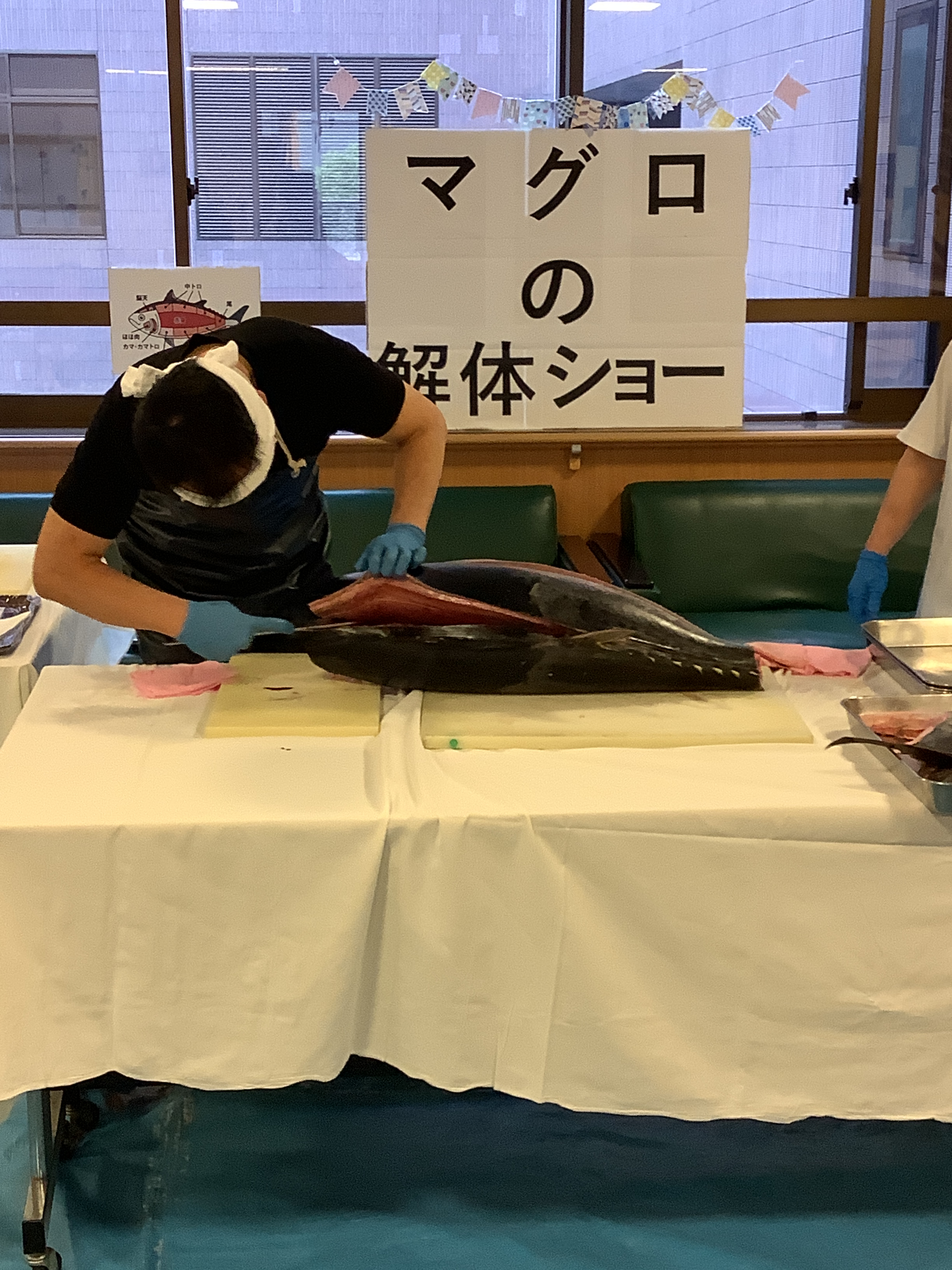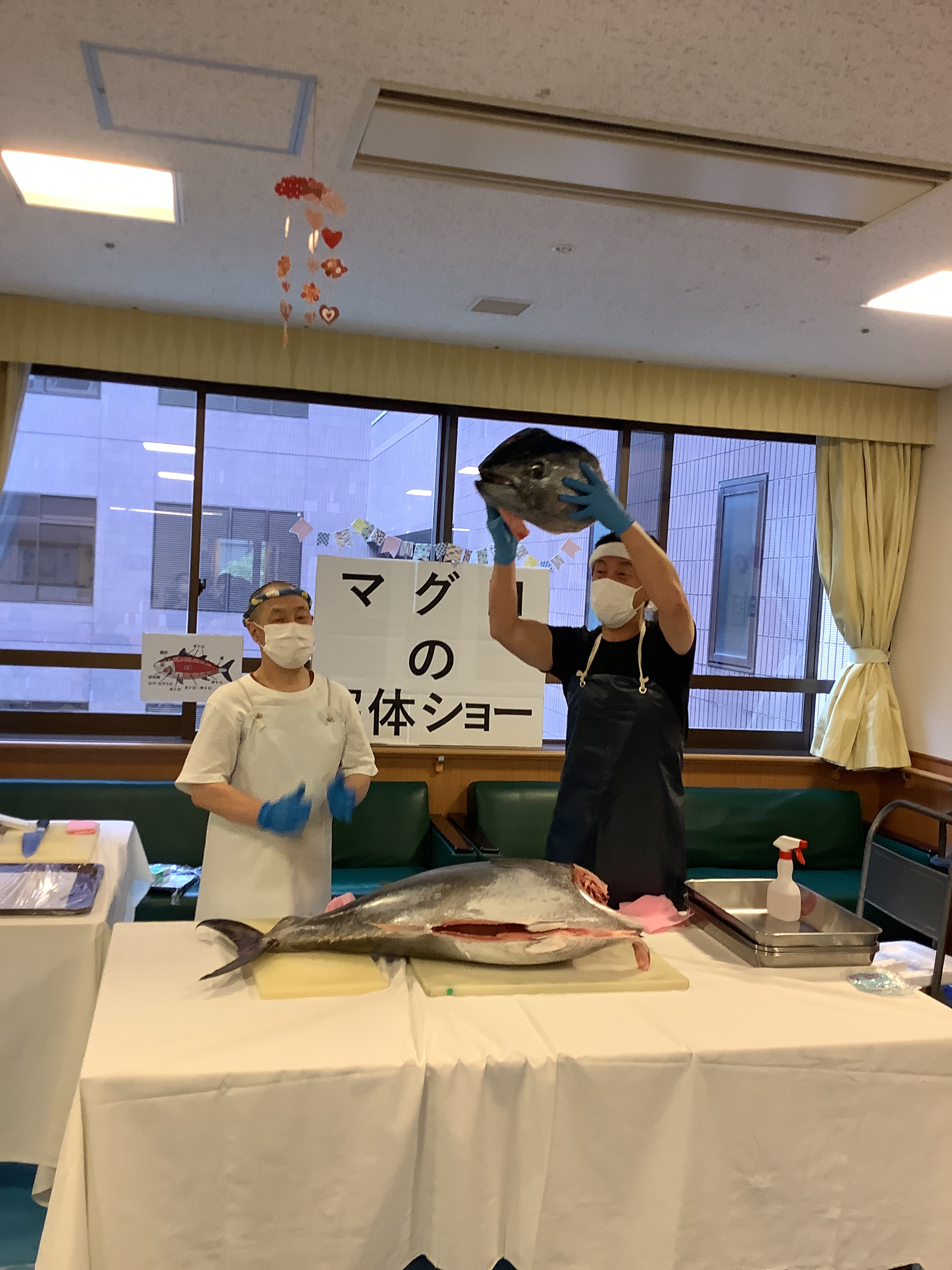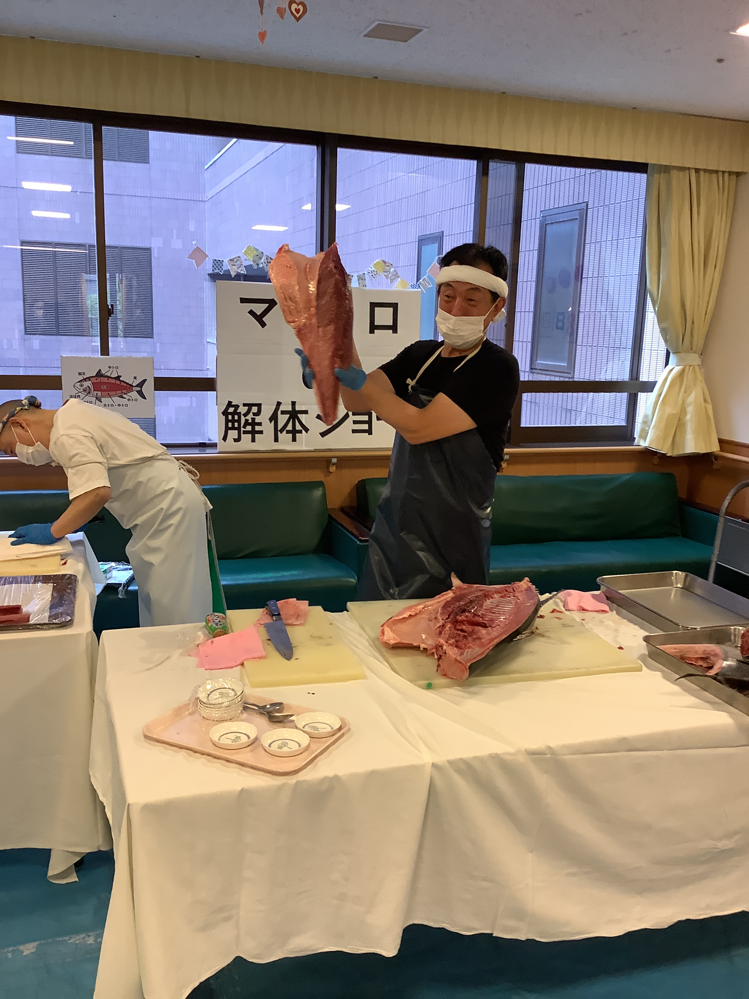 マグロは長崎産で約30㎏!お二人がかりで行う迫力のある解体に利用者様から大きな歓声があがっていました!!