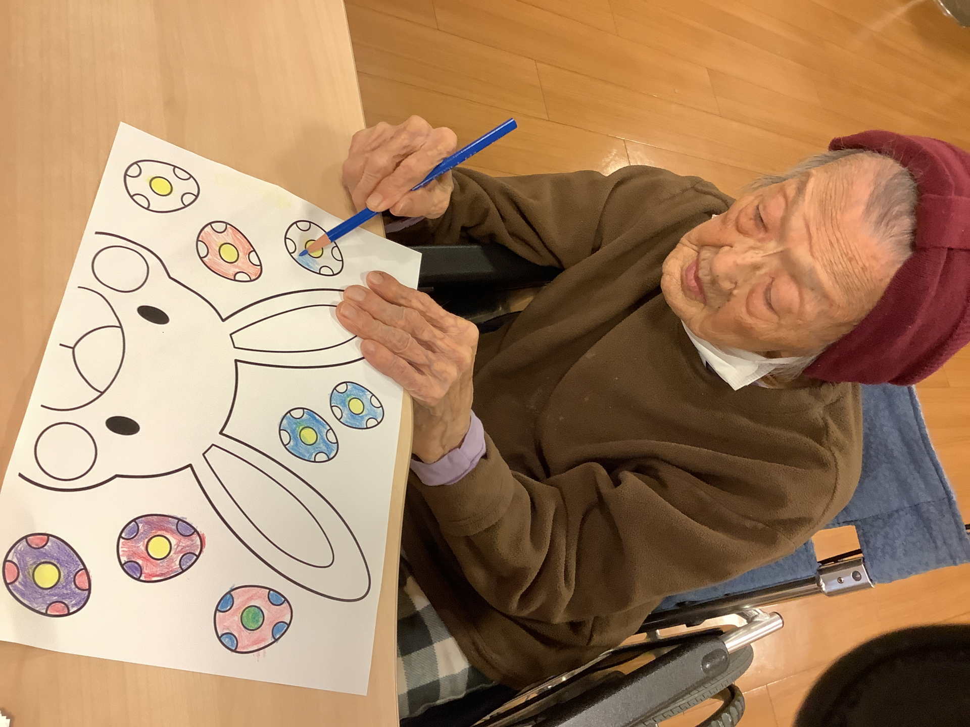 夜間巡回中に 静かな廊下で散歩していた。伺うと眠れない様子である事を気が付いた。職員が少しでも落ち着いて過ごせるようにと塗り絵を提案していた。