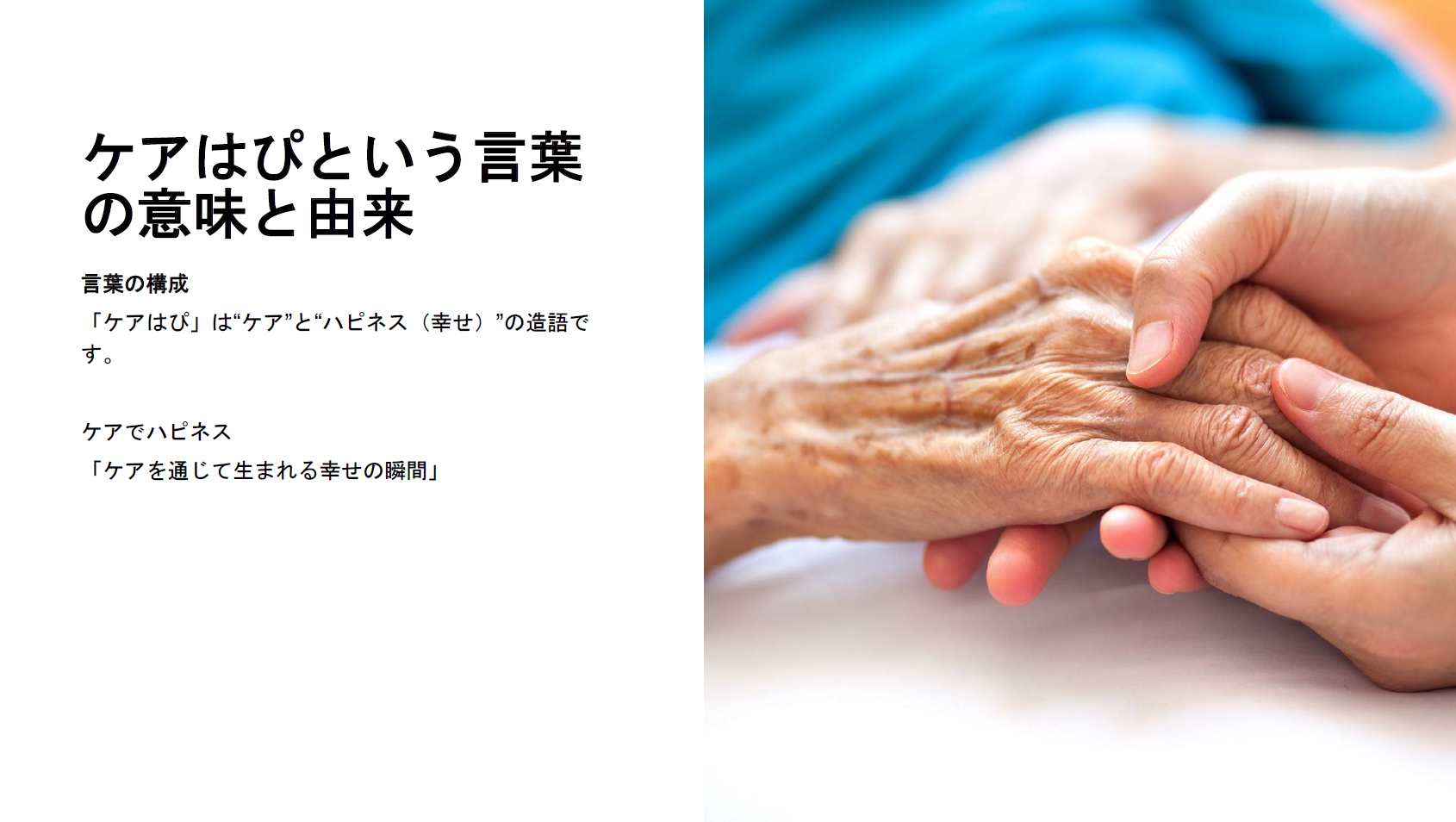 「ケアはぴ」は、“ケア”と“ハピネス(幸せ)”を組み合わせた造語です。