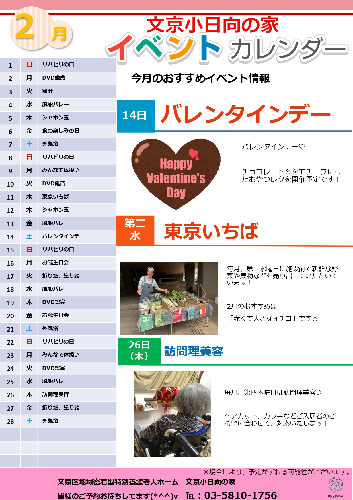 特養ショートステイ 2月イベントカレンダー(足立区、荒川区、文京区)