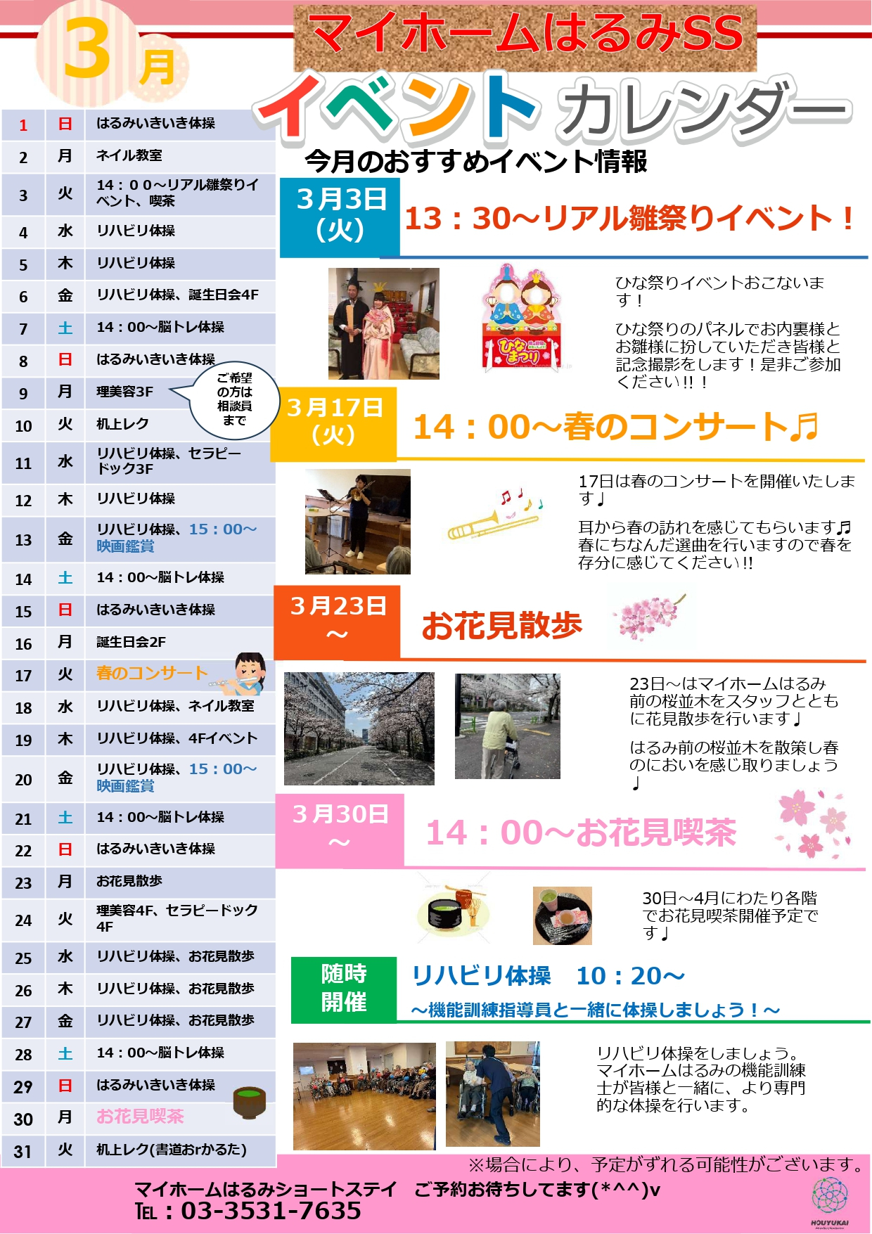 2026.02.26 お知らせ 特養ショートステイ 3月イベントカレンダー(中央区、千代田区) Tweet シェアする 当施設の特別養護老人ホームおよびショートステイでは、季節を感じながら楽しくお過ごしいただけるよう、毎月さまざまなイベントやレクリエーションを実施しております。このたび、3月のイベントカレンダーが完成しましたのでお知らせいたします。※イベント内容は状況により変更となる場合がございます。あらかじめご了承ください。 ■マイホームはるみ(中央区) ■淡路(千代田区) 一覧へ戻る