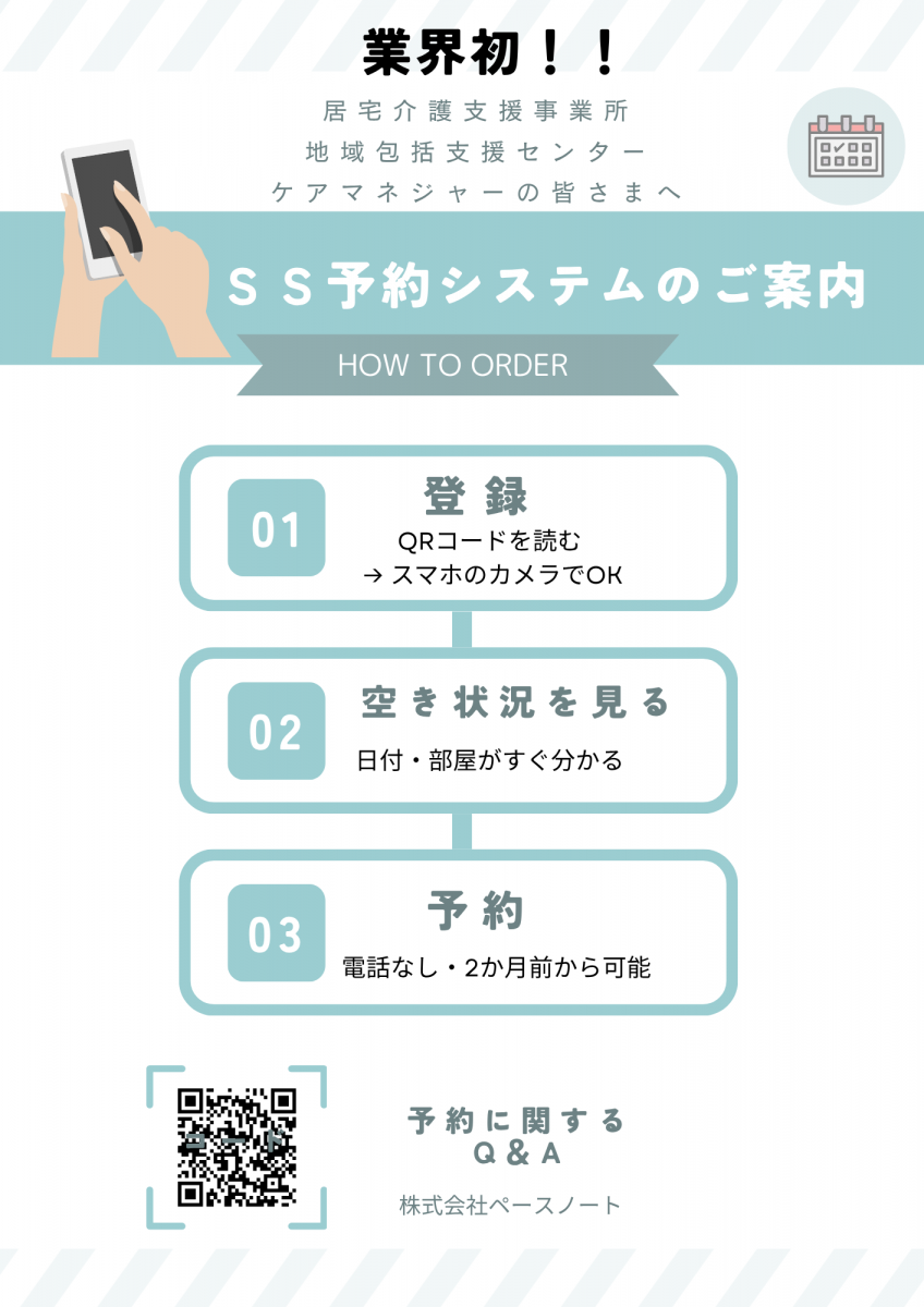 2026.03.31 ニュース 【new】ショートステイのWEB予約を、 4月1日より開始いたします。 Tweet シェアする ショートステイのWEB予約を、4月1日より開始いたします。 空き状況の確認・申込みがWEBで完結します。ご利用にあたっては、初回のみ新規登録が必要です。 迅速な受入調整にも対応いたしますので、ぜひご活用ください。 ▼QRコード・WEB予約はこちら 一覧へ戻る