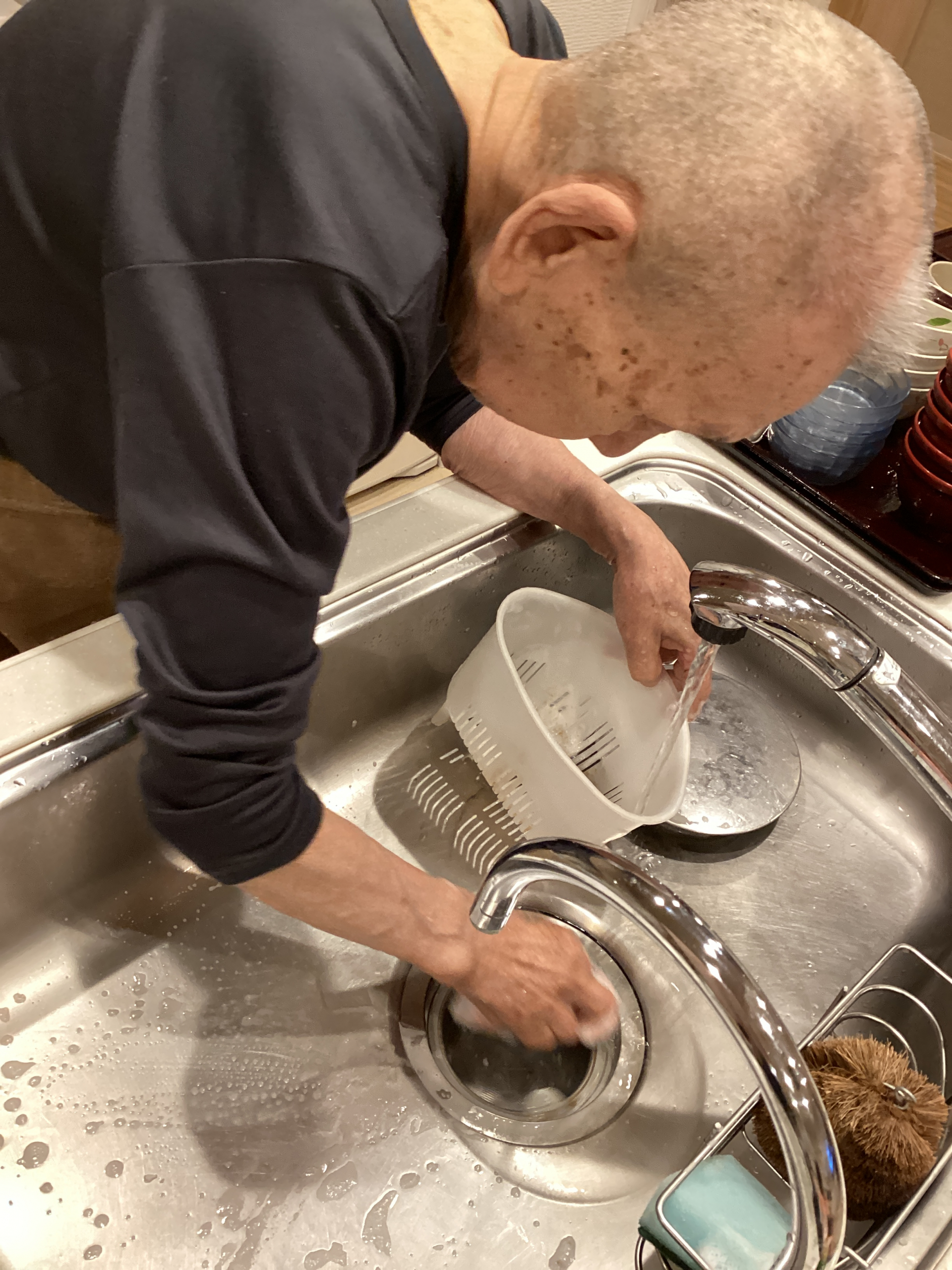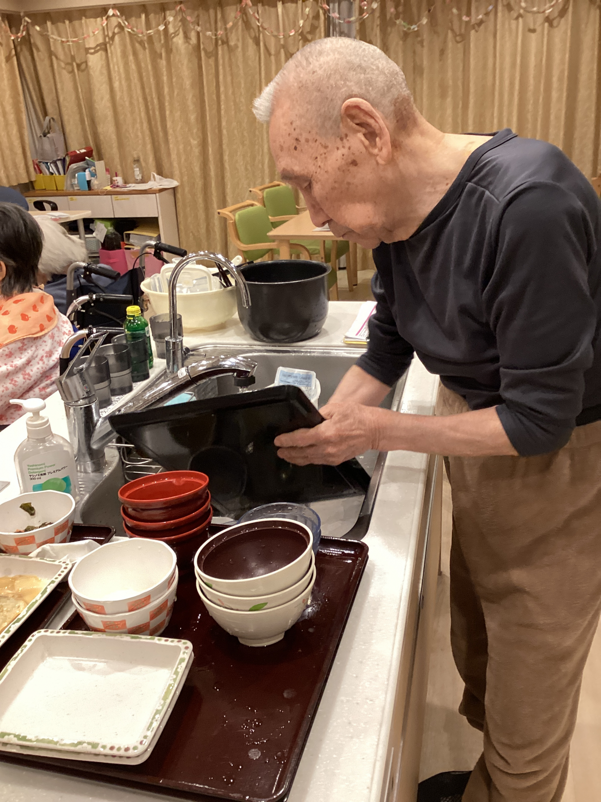 「2週間くらい入院していたから、リハビリだよ、昔剣道をやっていた時代にお面を叩かれるとみんなの食器を洗うことになっていたんだ、だから食器洗いは得意なんだ」と仰っておりました。とても手際がよくスピーディーに洗い上げてくださいました。