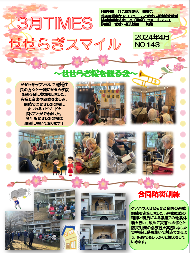 2024.04.17 活動報告 3月TIMES★せせらぎスマイル★ Tweet シェアする みなさまこんにちは!せせらぎ特養です。 R6.3月のせせらぎTIMESを発行致しました!イベントの様子をぜひご覧くださいませ。 加藤 前の記事 2024.05.01 活動報告 5月献立 次の記事 2024.04.14 活動報告 恒例の・・・♬ 一覧へ戻る
