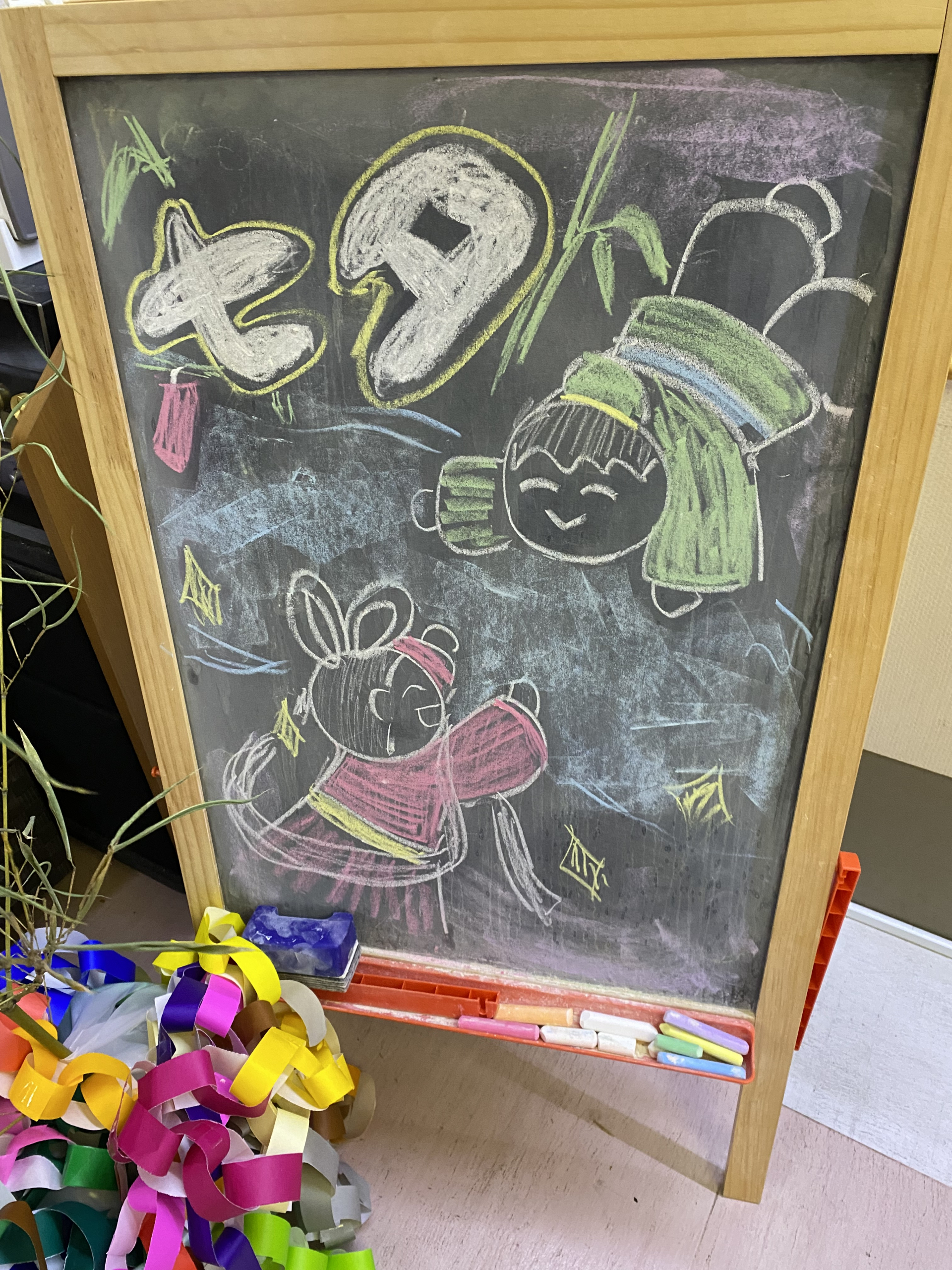 これはフロアの様子です!笹を飾ったり、絵が得意な職員が黒板に書いたり、天の川を飾ったり、、、