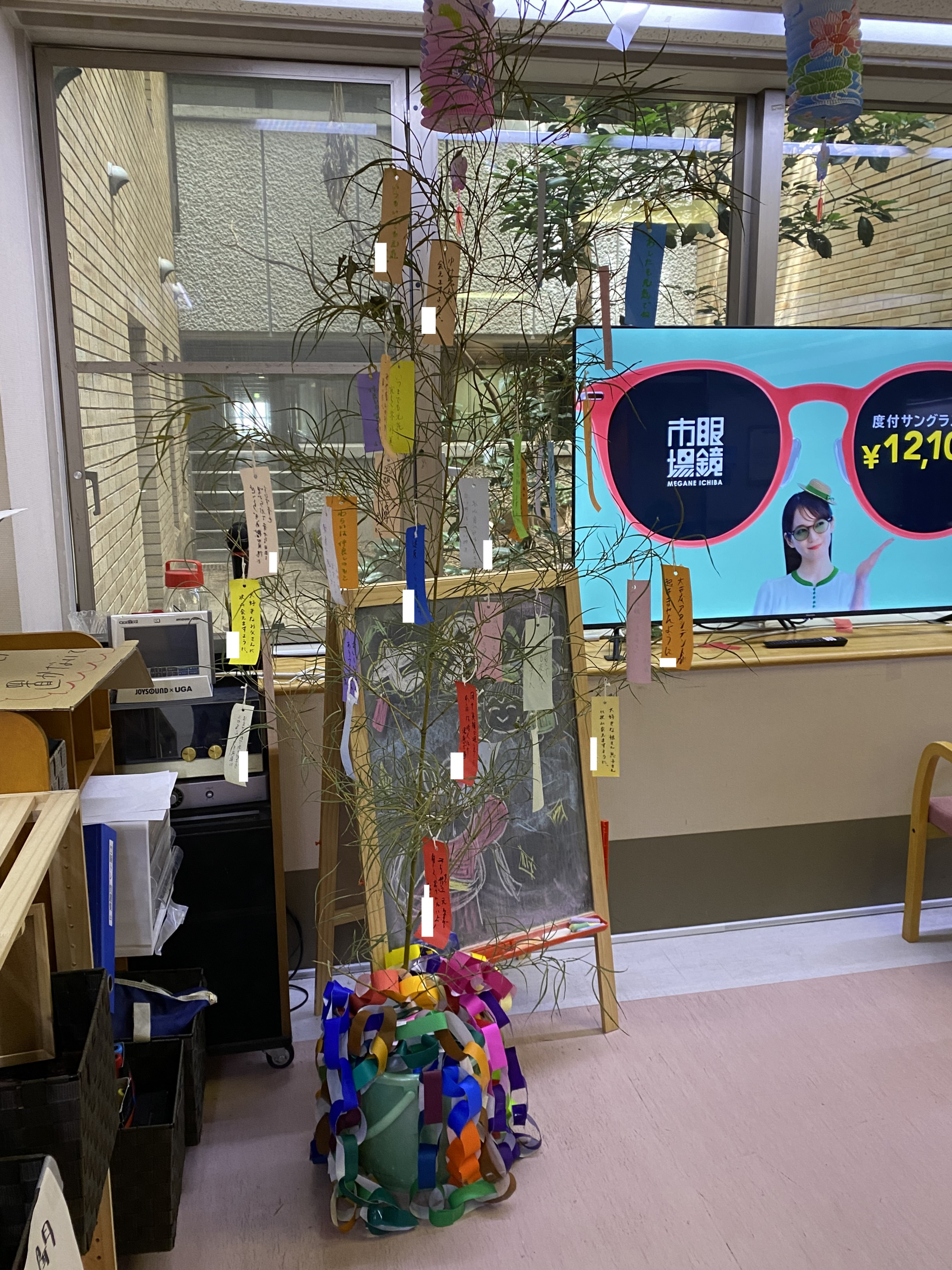 もうすぐ七夕、先日は短冊を書いている利用者様のお姿を投稿しましたが、今回は七夕の飾りつけをご紹介します(^^)/