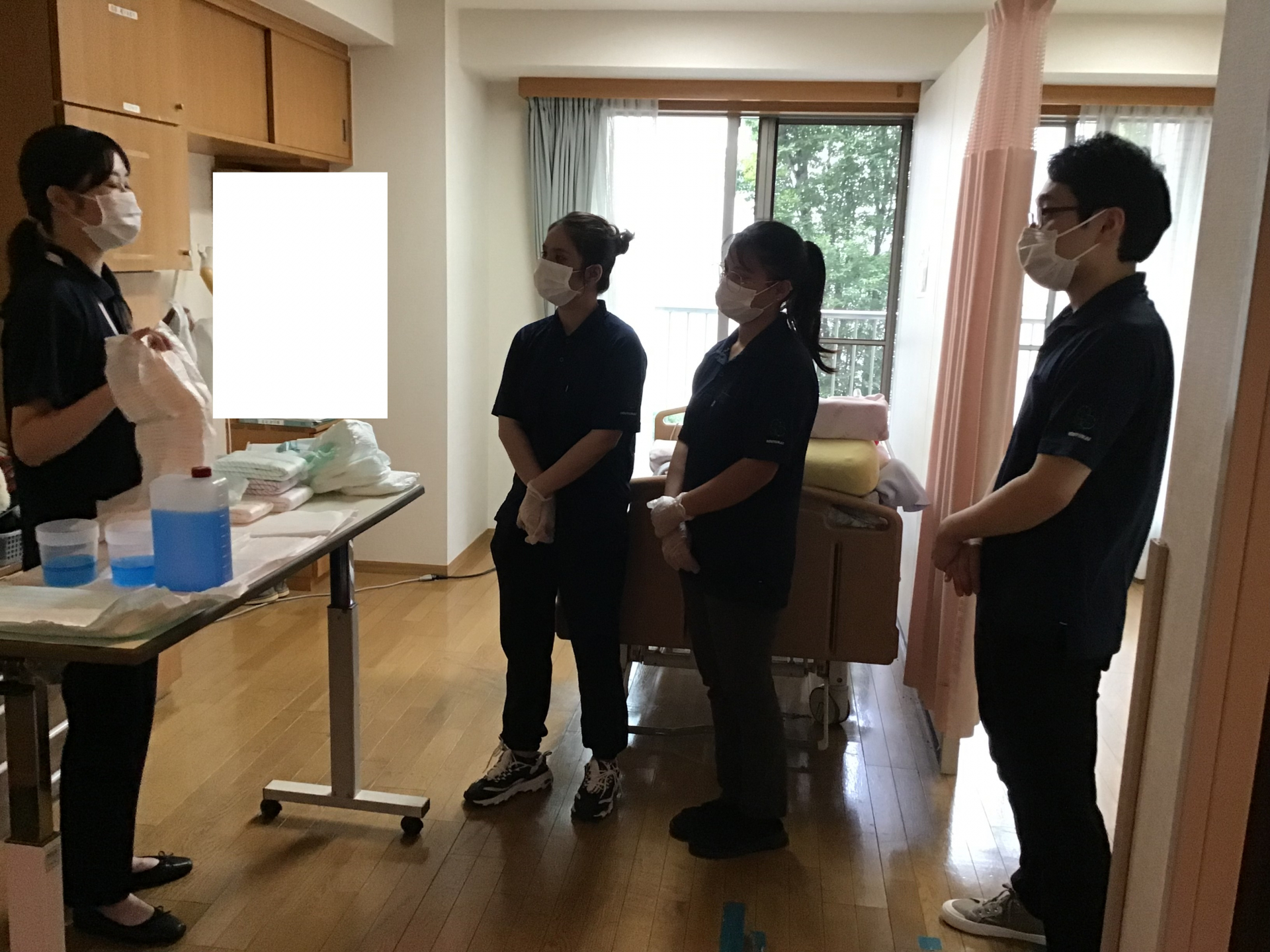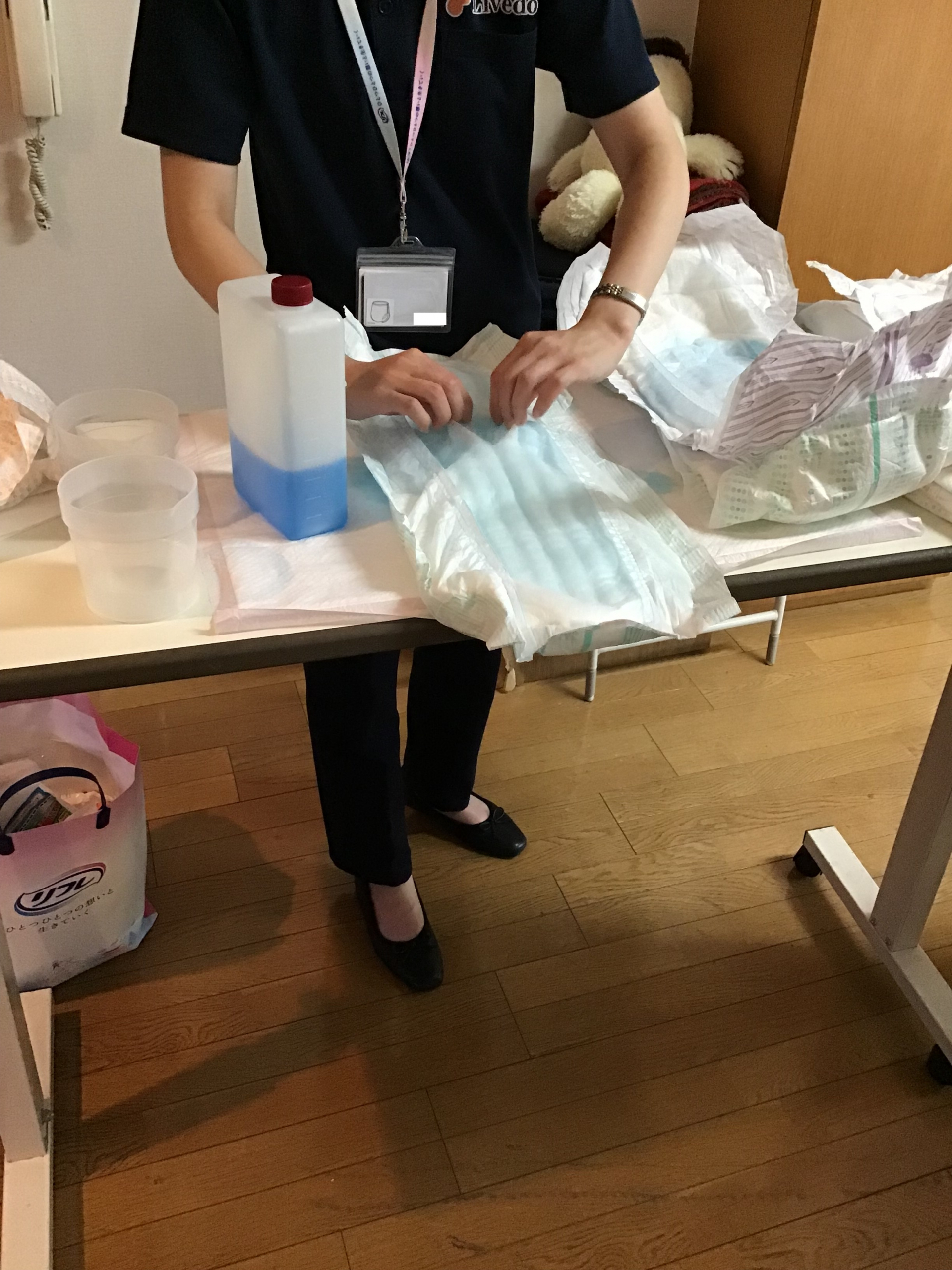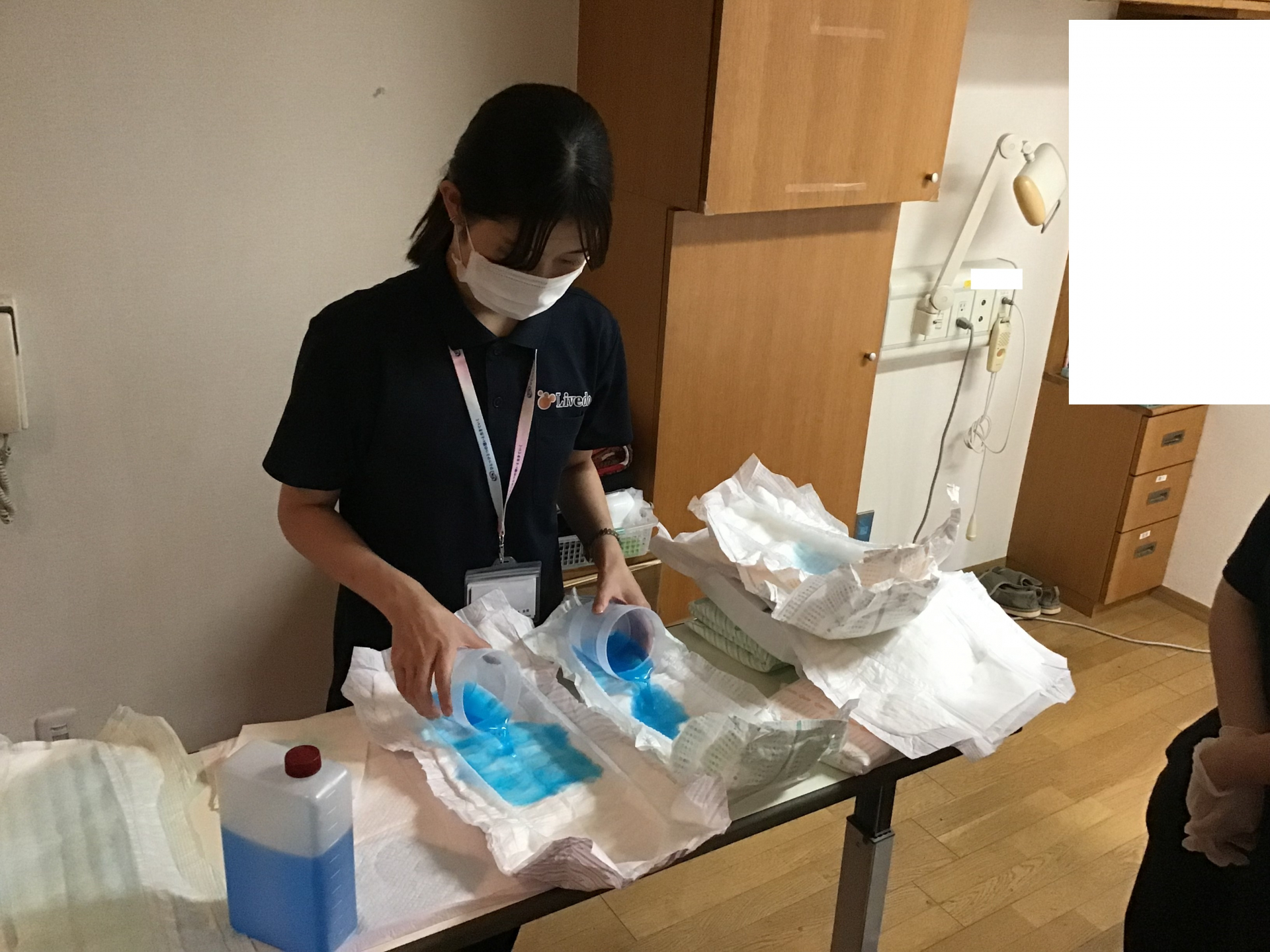 研修では、オムツやパットの構造、使用時の注意点を教えていただき、その後に実際に排泄介助を行いながら再度注意点の確認やオムツの装着の仕方について学びました。