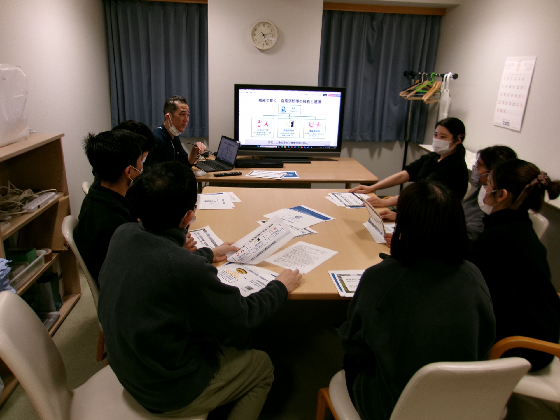 経路を確認した後は、座学にて、消火器の使用方法や災害時の動き方、備えなどを確認していきました。