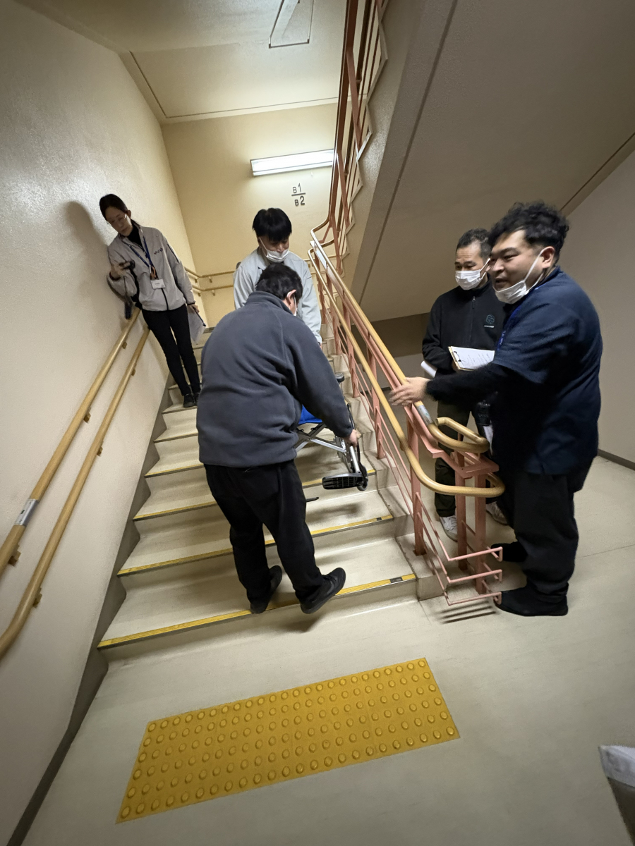 その後は、エレベーターが使用できないことを想定して、車いすの階段昇降の方法を確認しました。