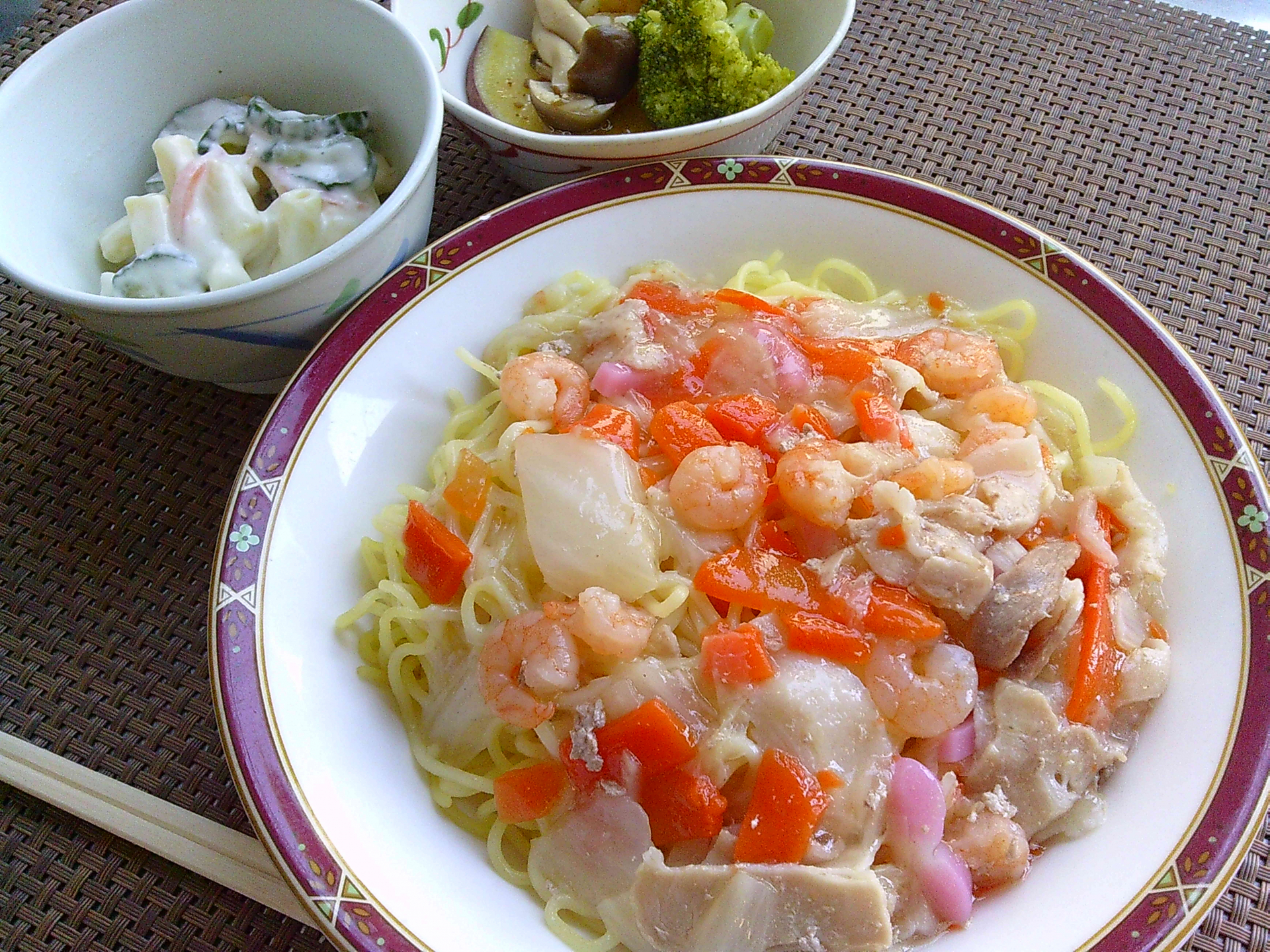 海老、豚肉、かまぼこ、そしてお野菜の出汁が効いた、やさしい味のあんかけです。