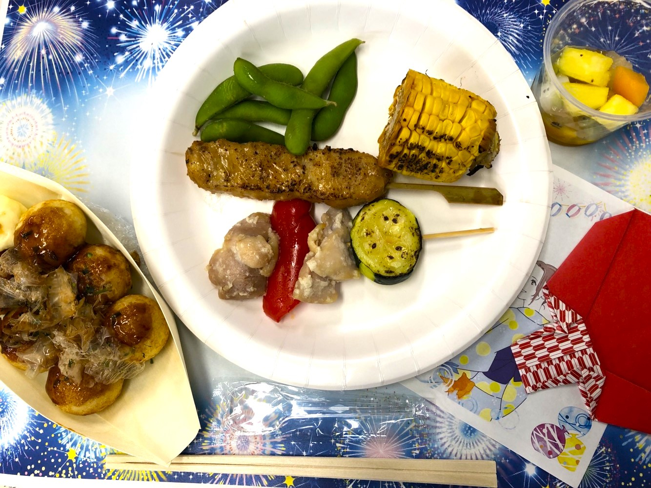 また昨年、塩分を心配された方がおられたため、野菜を増やして野菜串にし、枝豆も付けました。