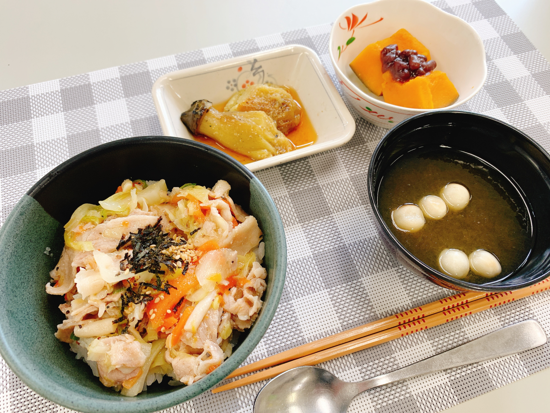 豚のねぎ塩レモン丼、清汁、南瓜のいとこ煮、焼き茄子