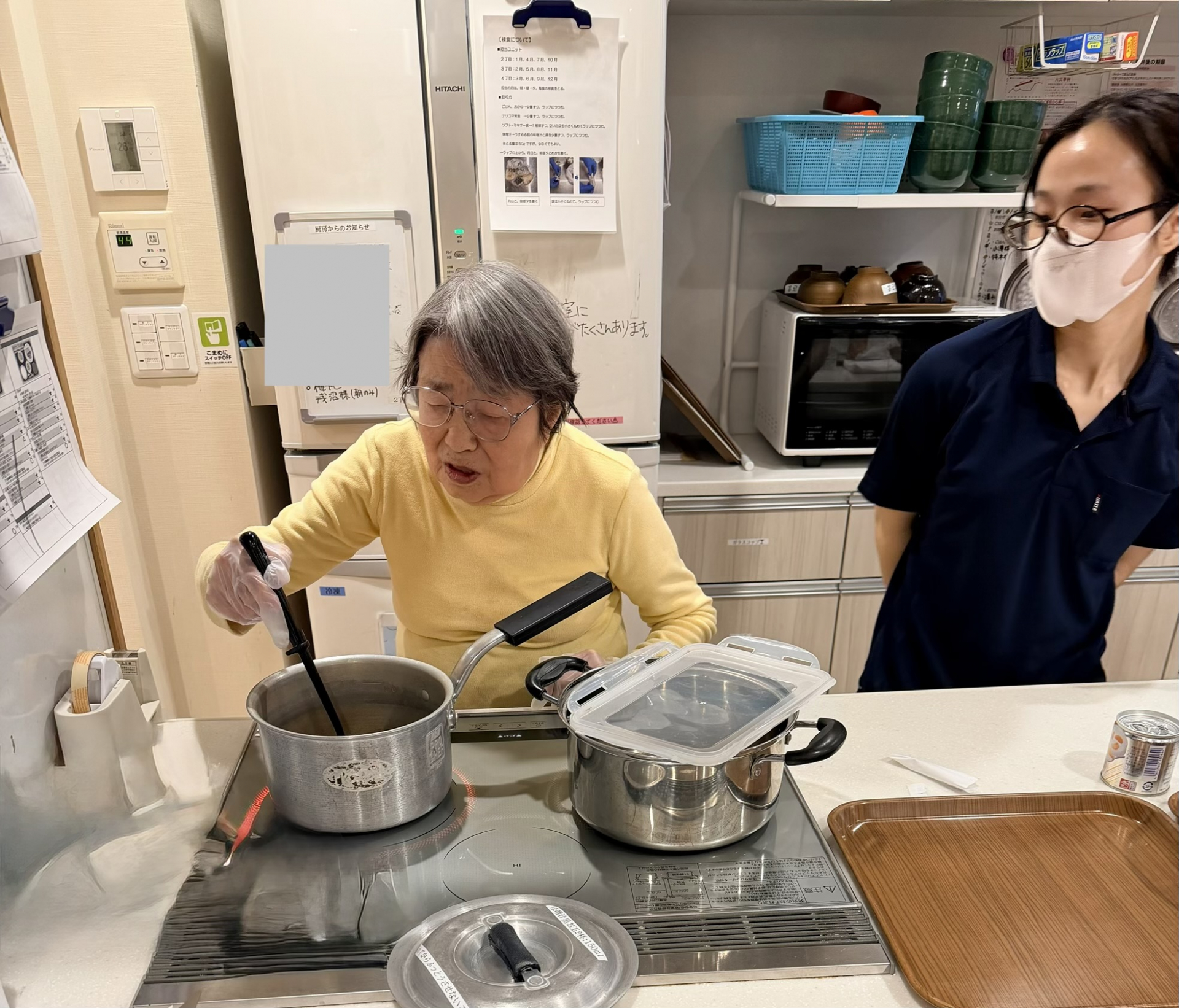 入居者にも参加して頂き、鍋で寒天液をゆっくり混ぜながら