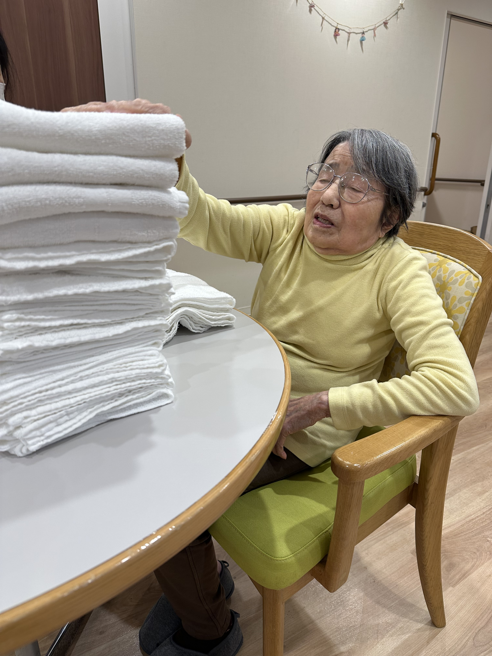 毎日の生活はとても穏やかです。 朝食後、テーブルの上でゆっくりとタオルを畳み、洗濯した服も一枚一枚丁寧に畳んで頂きます。