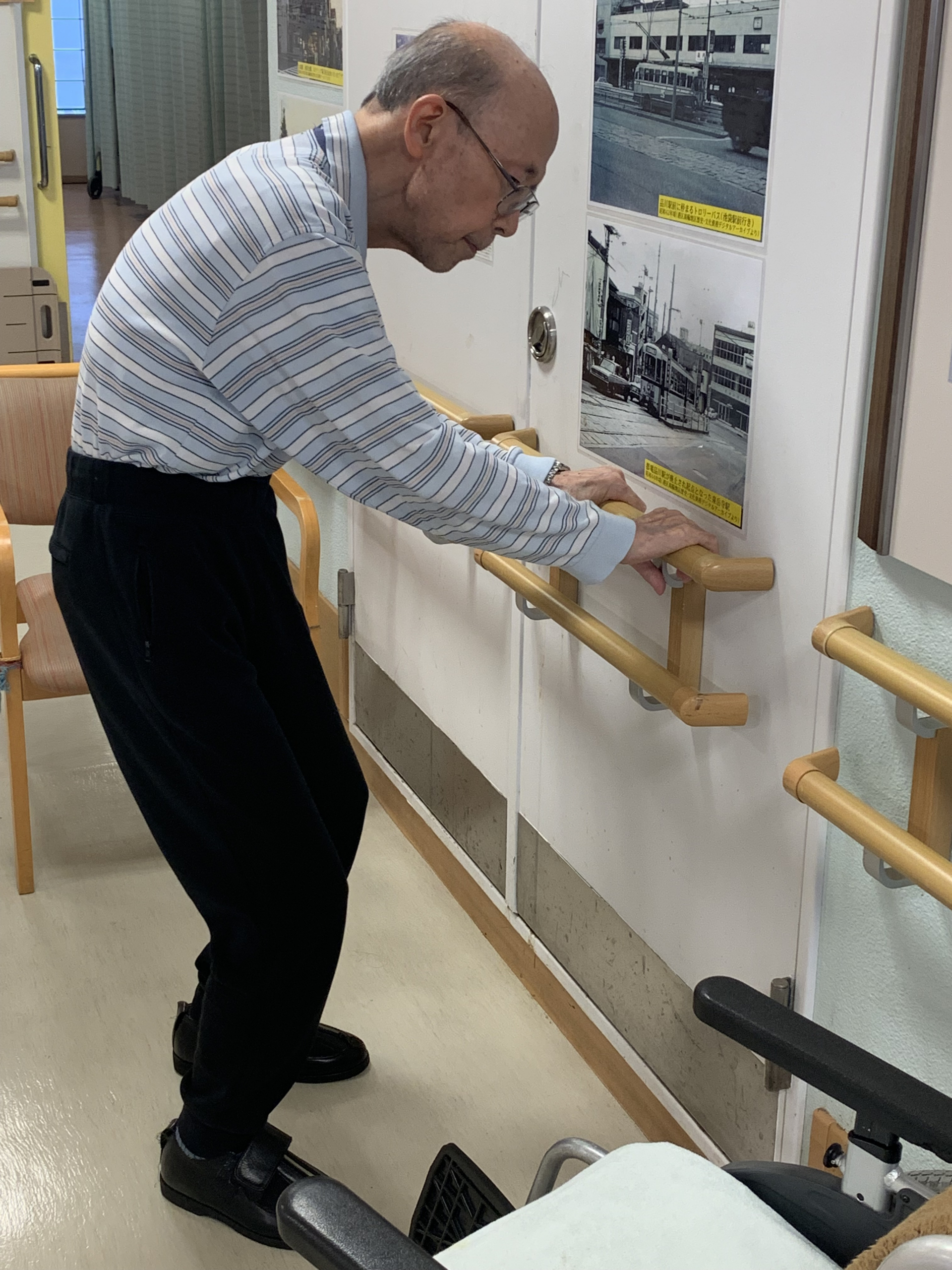 手すりににつかみながら「立つ」「歩く」「座る」の繰り返しで体操や環境整備、本人のペースで安全な対策を講じることが重要です。