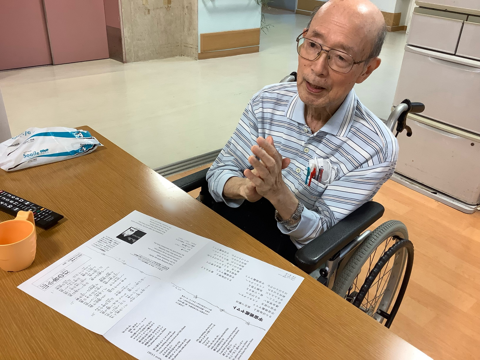 「ダイアナ」や「宇宙戦艦ヤマト」、「ふるさと」などを歌われ、ご入居者様も皆さま楽しそうに手拍子されながら歌っておりました。