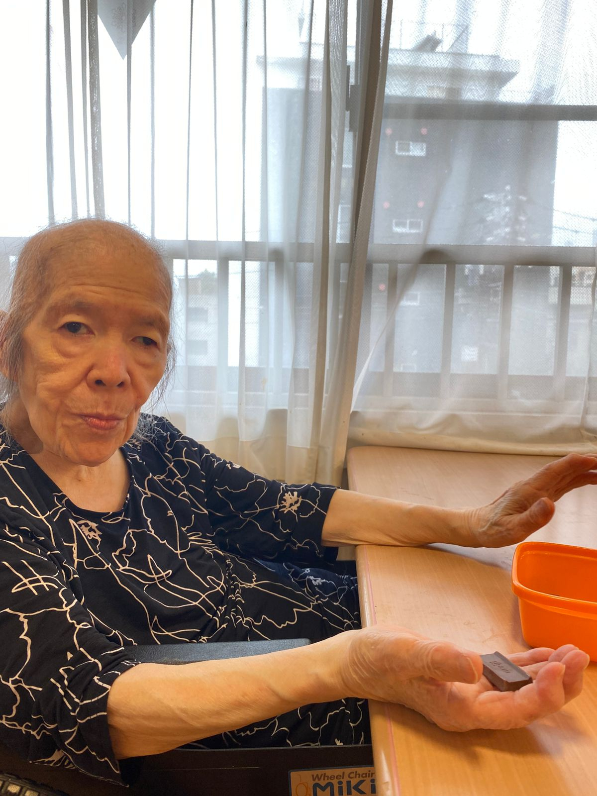 職員が声をかけると、「何か食べ物ある?」とニコニコしながら仰られました。K様のチョコレートを5つお渡しすると、とても嬉しそうに「美味しそうだね、頂きます!」と笑顔で召し上がっていました。