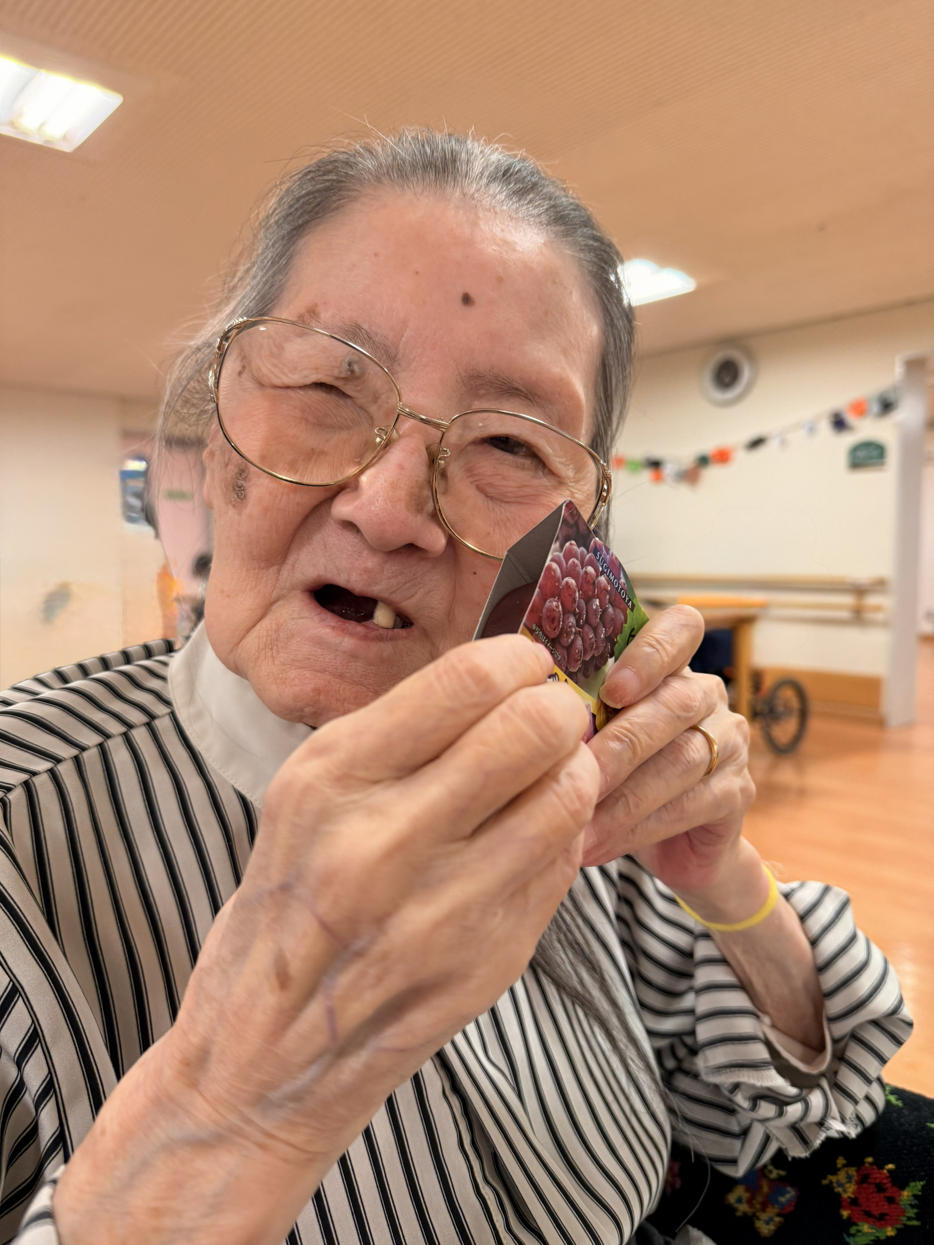 本日のおやつ時間では、きれいなぶどうゼリーを手にされた H様が素敵な笑顔を見せて下さりました。
