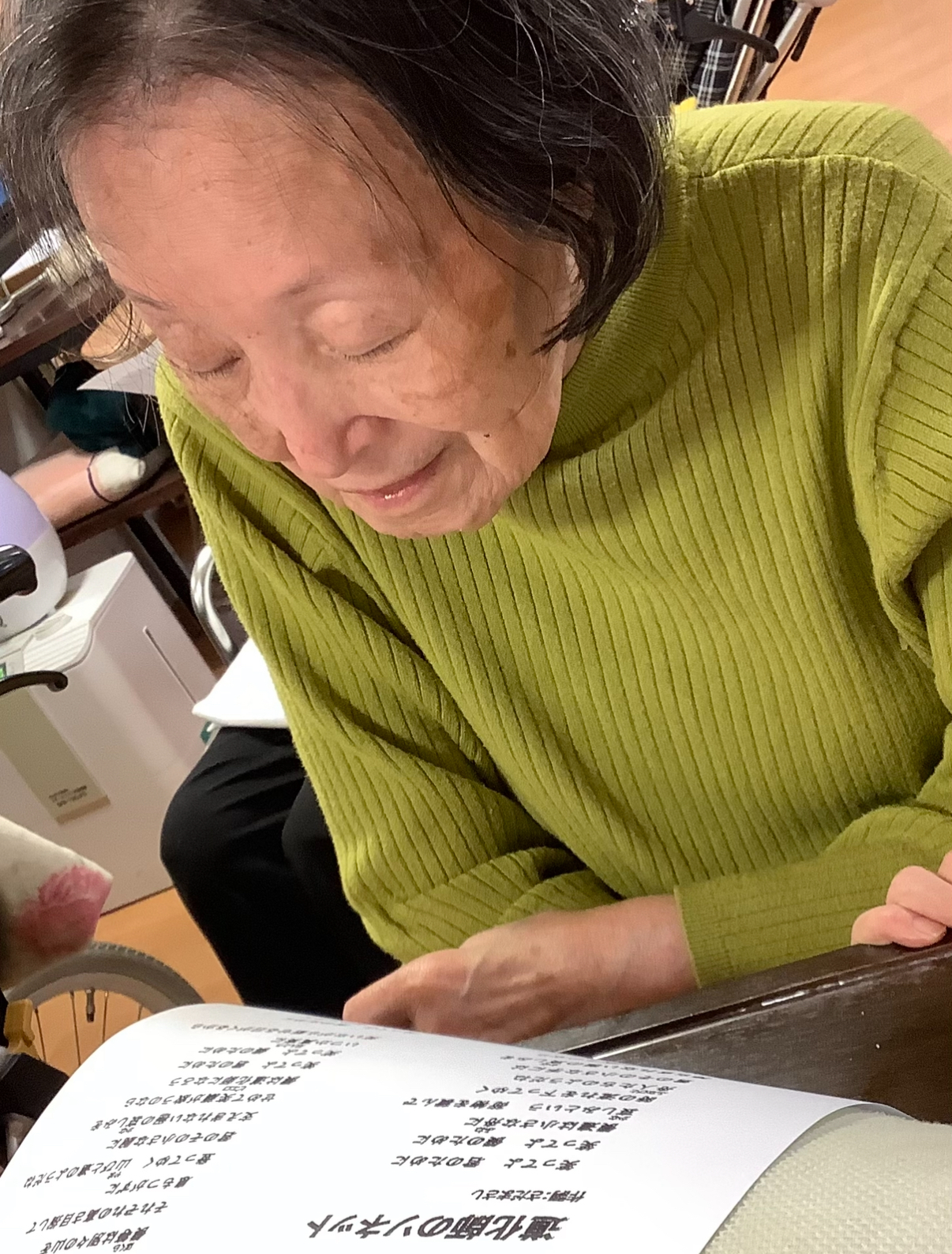 歌詞カードを見ながら、職員とご利用者様で一緒に歌いました。