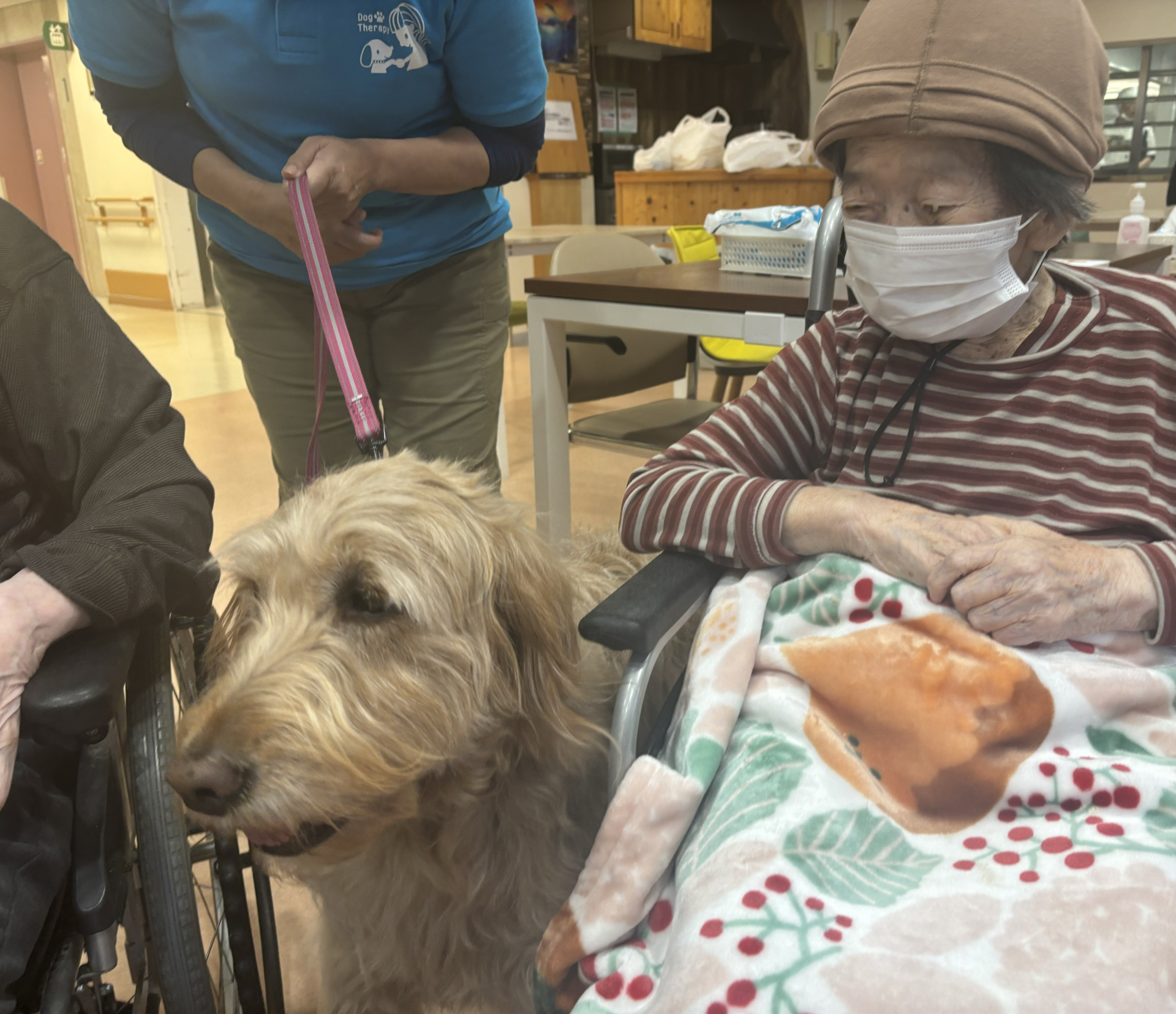何名かのご入居者が参加され、可愛らしいワンちゃんを見た瞬間、「おー、かわいいねえ」とたくさん触られておりました。