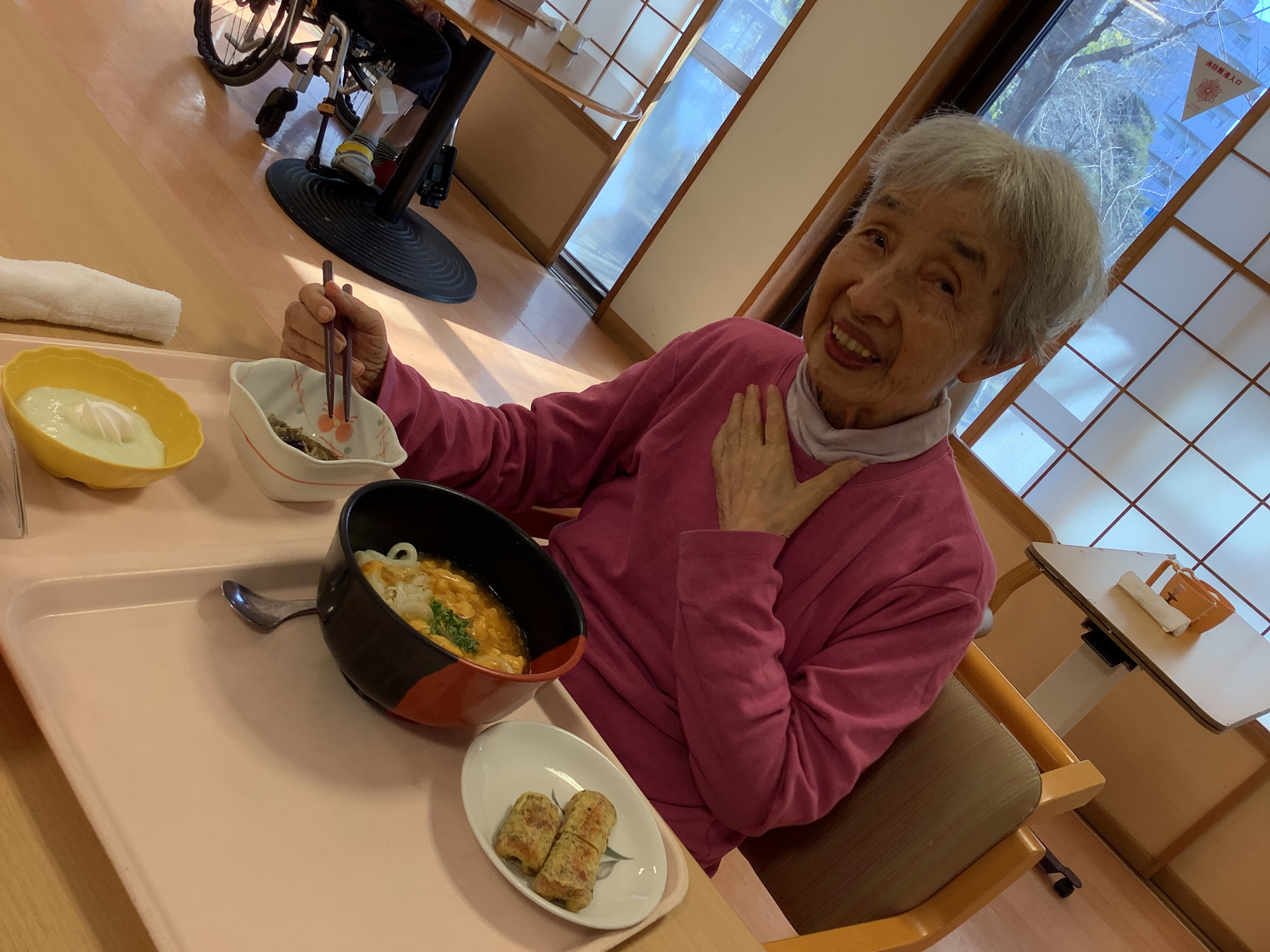 *麺の日・イベント食は…「たまごうどん定食」 【お食事風景】【入居者様の素敵な笑顔】*