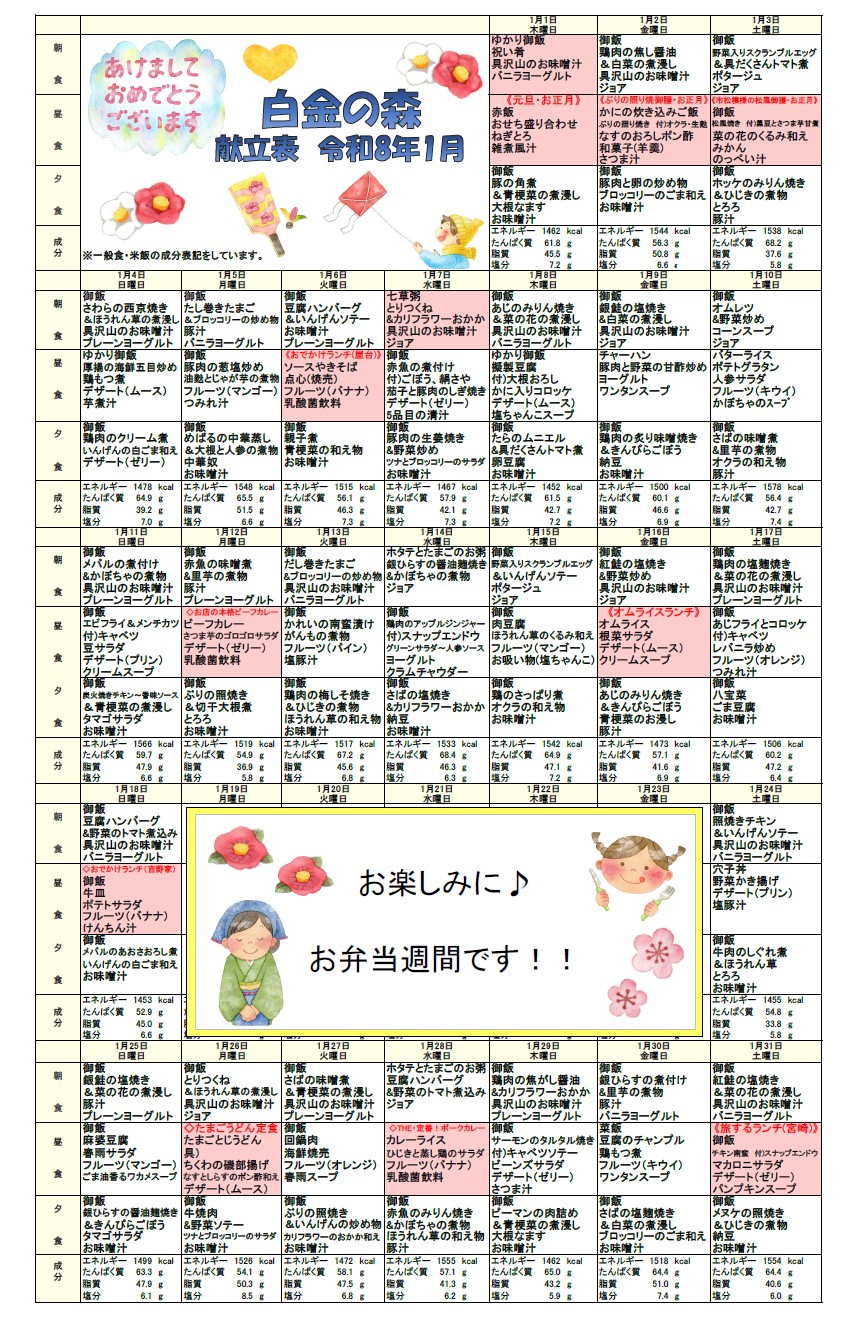 白金の森 1月の献立表です♪