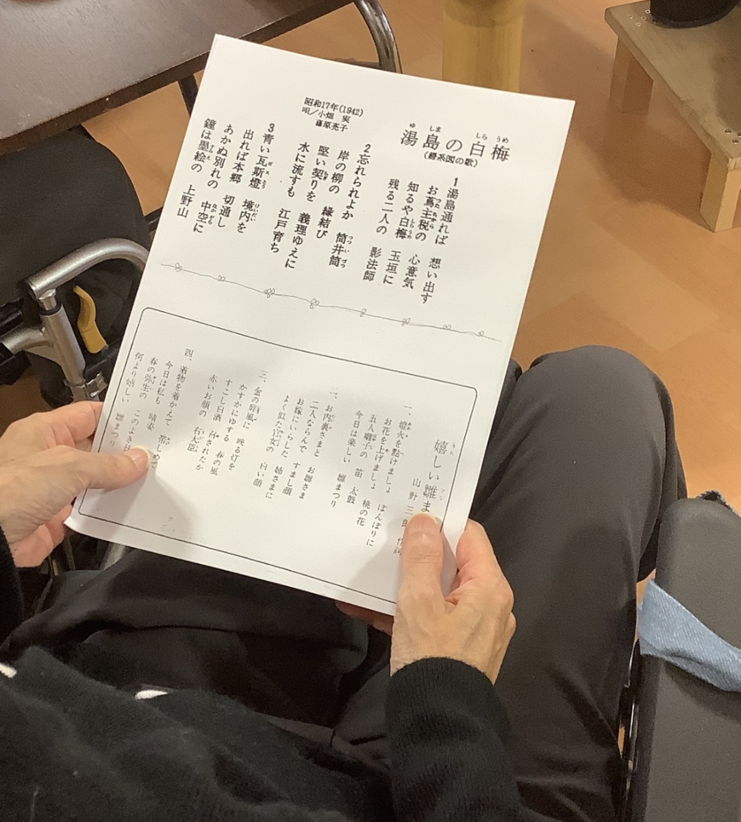 3月3日はひな祭りということもあり、今回は「嬉しいひな祭り」と「湯島の白梅」をご利用者様で一緒に歌いました。