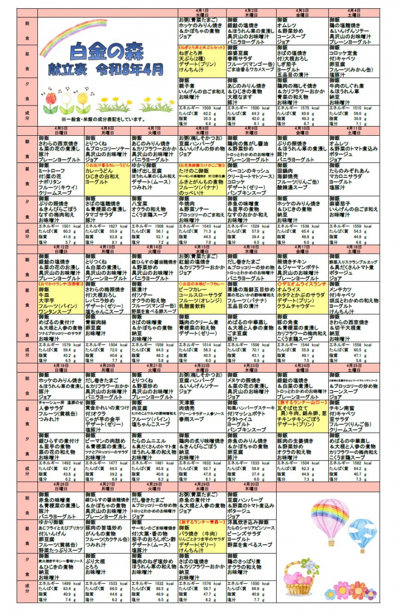 仕入れ等の関係で献立内容が変更になる場合がございます。ご了承ください。