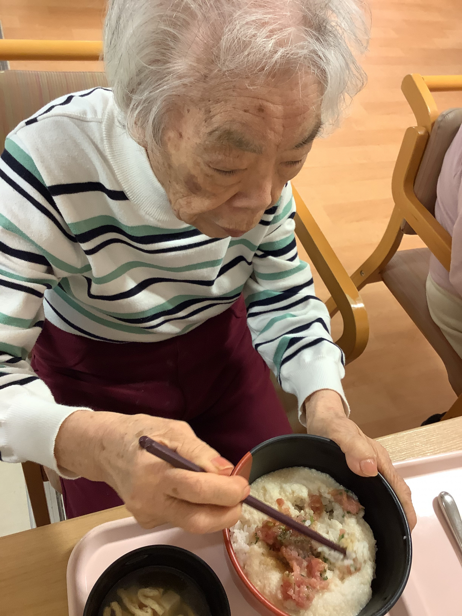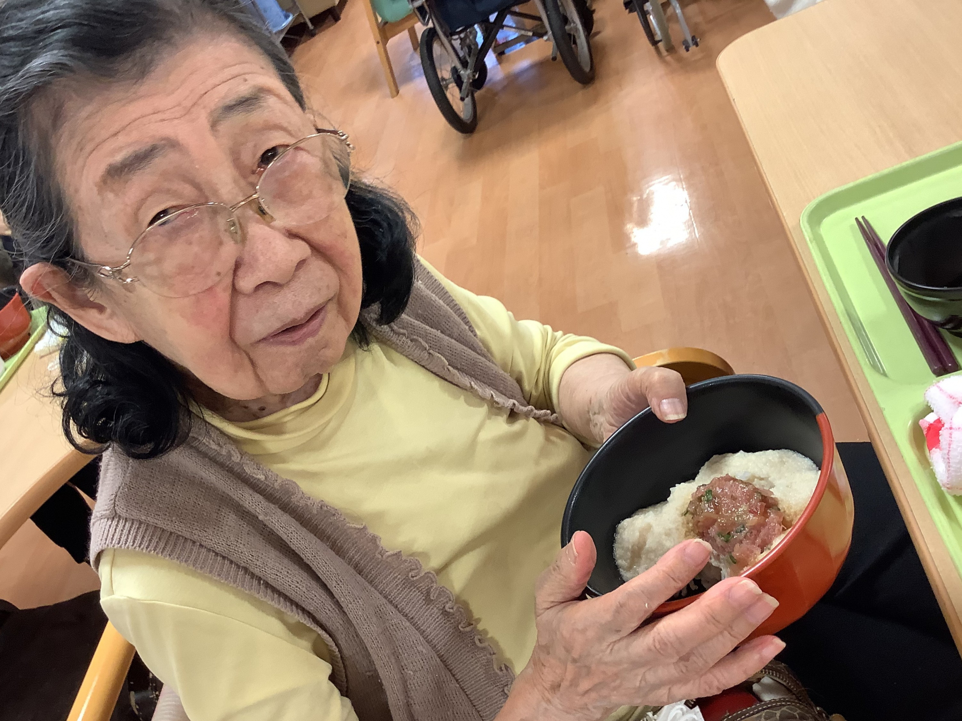 *大人気の生魚!イベント食は…「ねぎとろ丼と天ぷらセット」4/1【お食事風景】【入居者様の素敵な笑顔】*