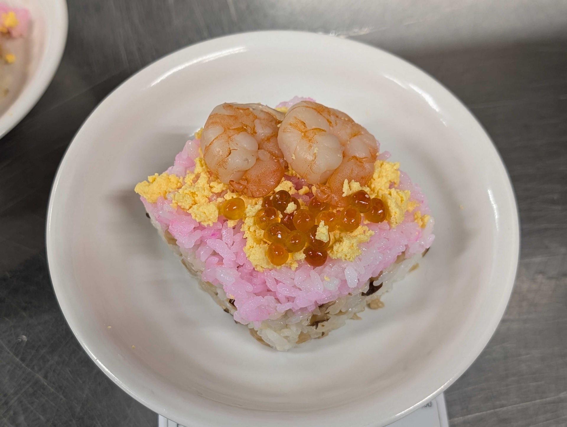 すし飯(白・椎茸入り)→すし飯(ピンク・桜でんぶ入り)の順につめて、卵、えび等の具を飾ってできあがりです。(食事でお世話になっているナリコマエンタープライズ様のレシピです)