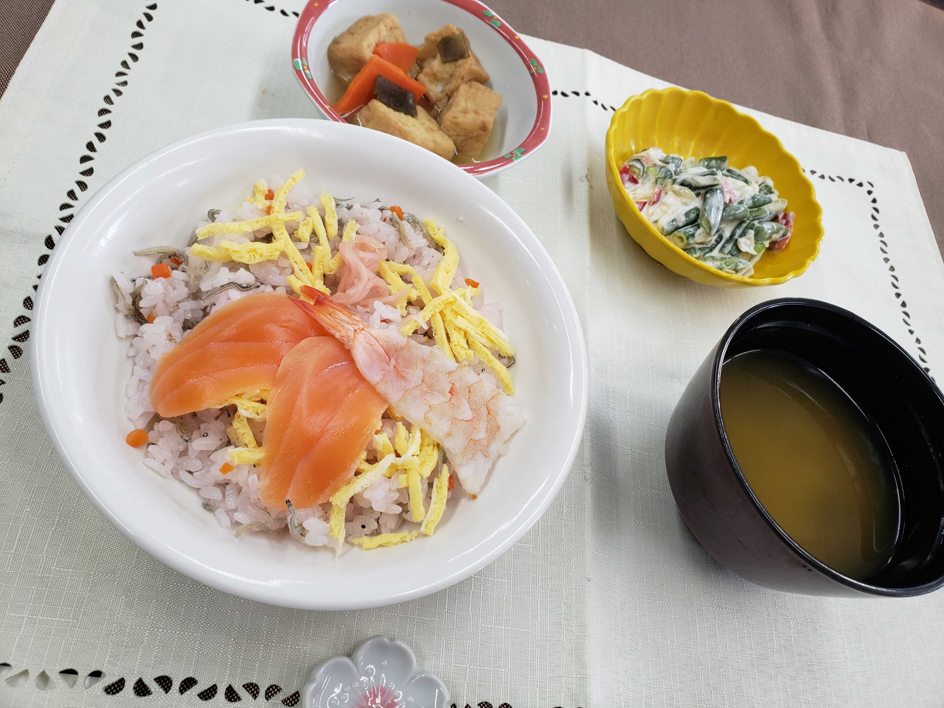 2025.04.07 お食事 本日の昼食【桜ちらし寿司】 Tweet シェアする 本日の昼食は桜のちらし寿司を提供しました。 桜の香りが酢飯から香って春らしさを感じて頂けました。 支援課 管理栄養士 前の記事 2025.04.11 お食事 やっぱり落語が好き!!! 次の記事 2025.04.06 お食事 ネイルアートを塗ってくださる^^ 一覧へ戻る