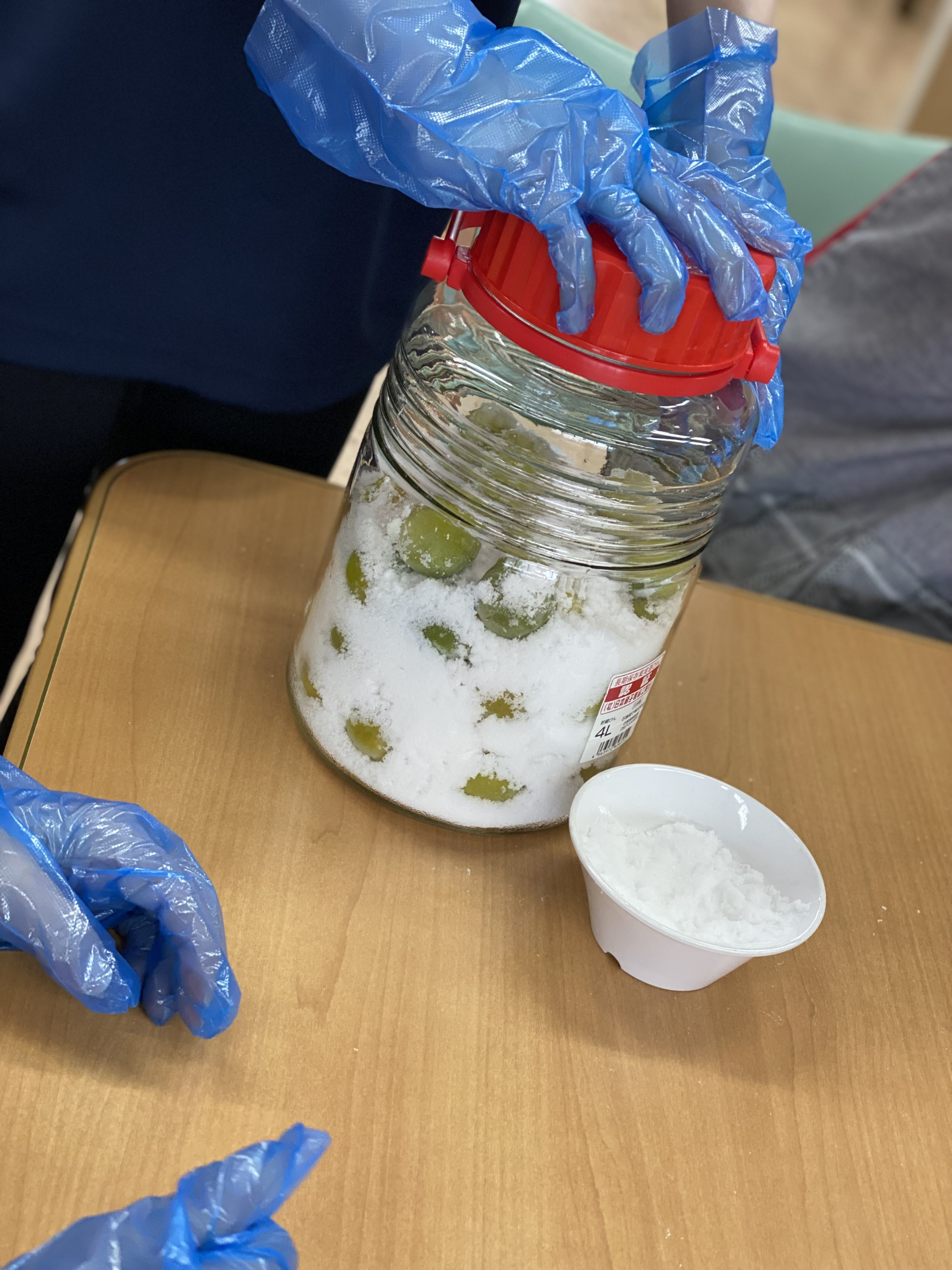 梅ジュースの作業としては、梅と砂糖を瓶に詰めてもらいました。